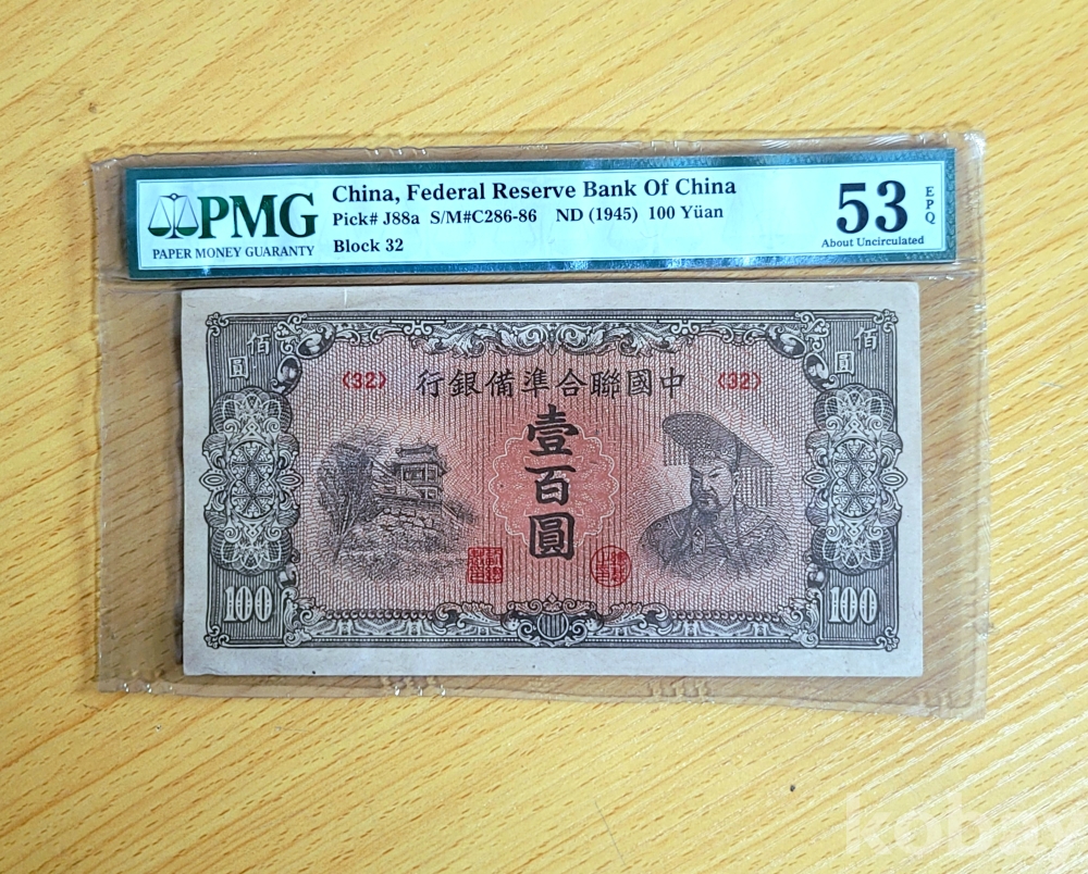1945년 발행된 중국연합준비은행의 100위안 지폐이며, Pick# J88a, S/M#C286-86, Block 32로 식별된 정품 100% 희귀구권입니다
