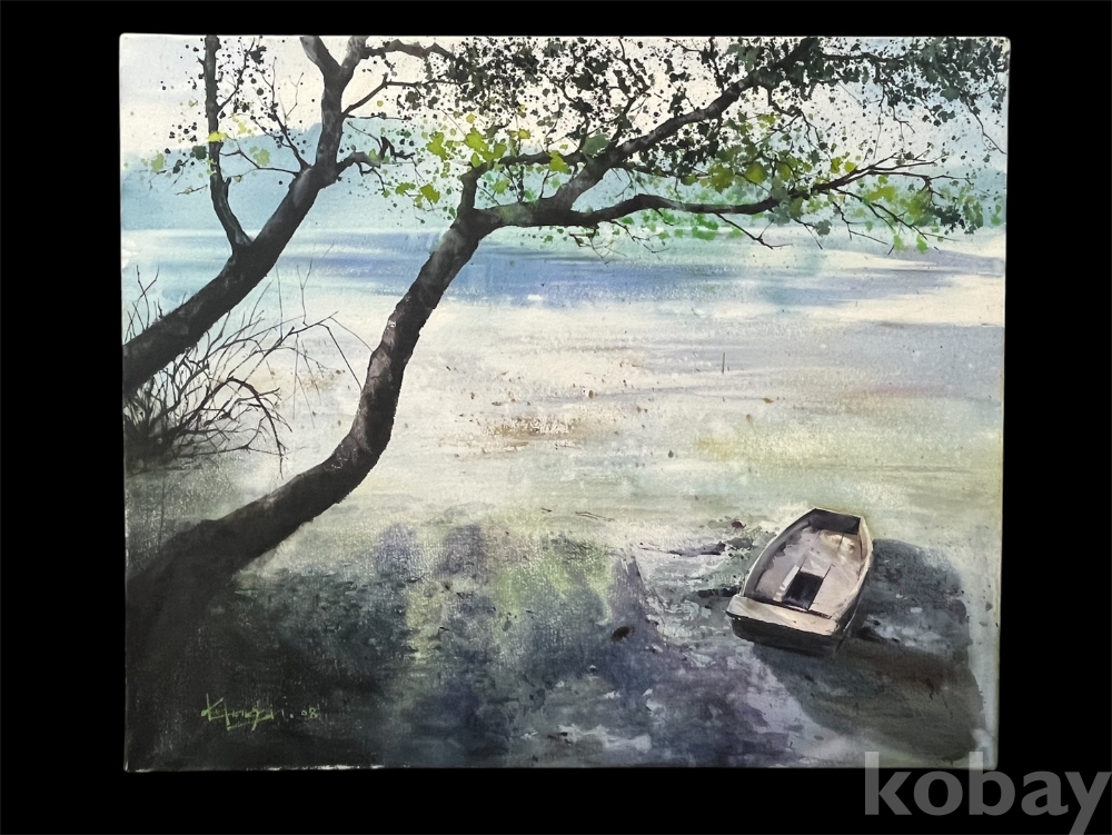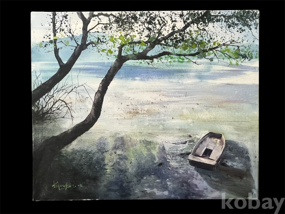 물이 빠지고난 자리에 홀로 남은 쪽배와 그 곁을 지키는 단단한 두그루의 나무가 그려져 있습니다.