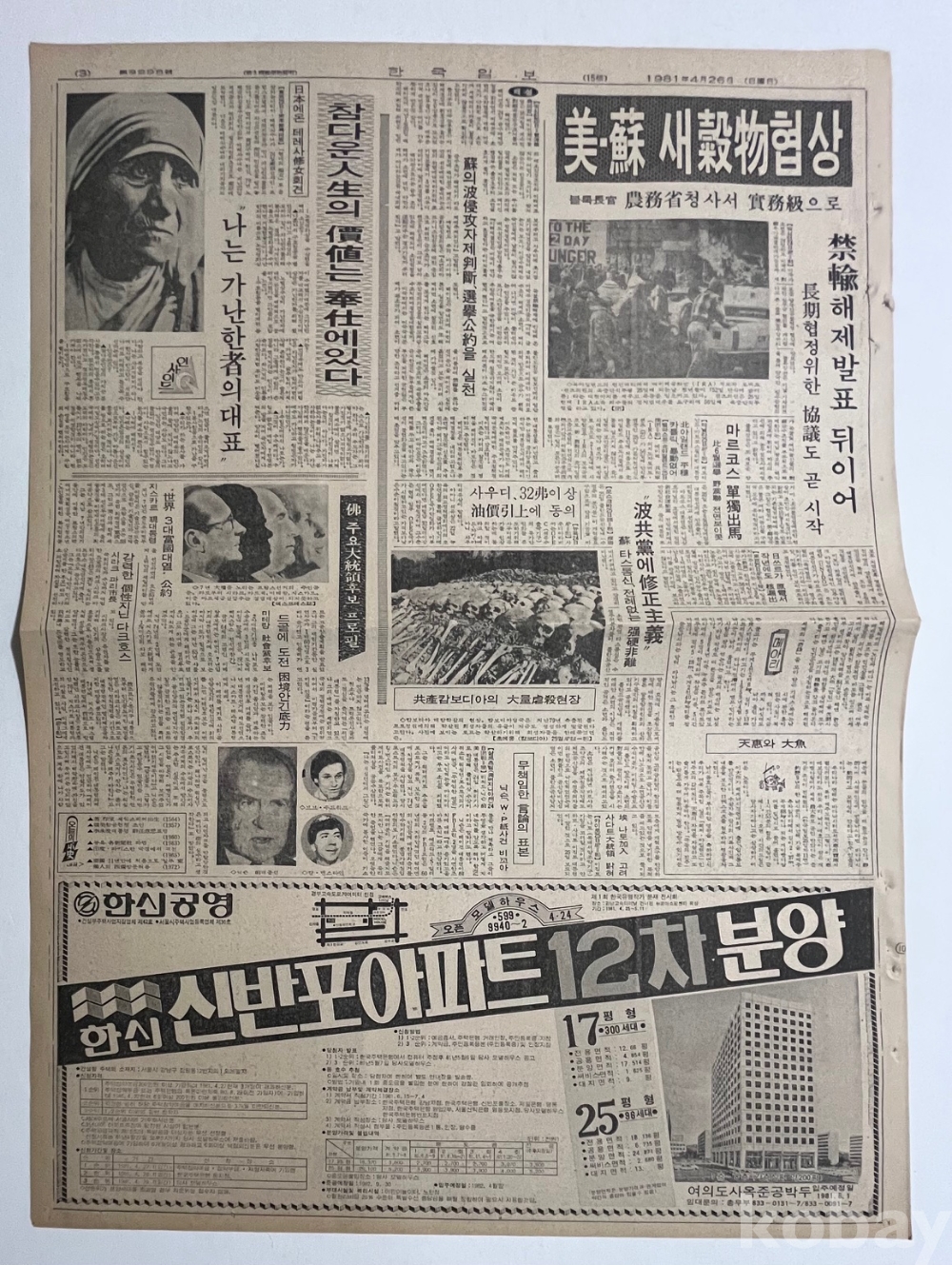 강남구 잠원동의 신반포아파트의 1981년 분양광고가 실린 한국일보 낱장입니다.