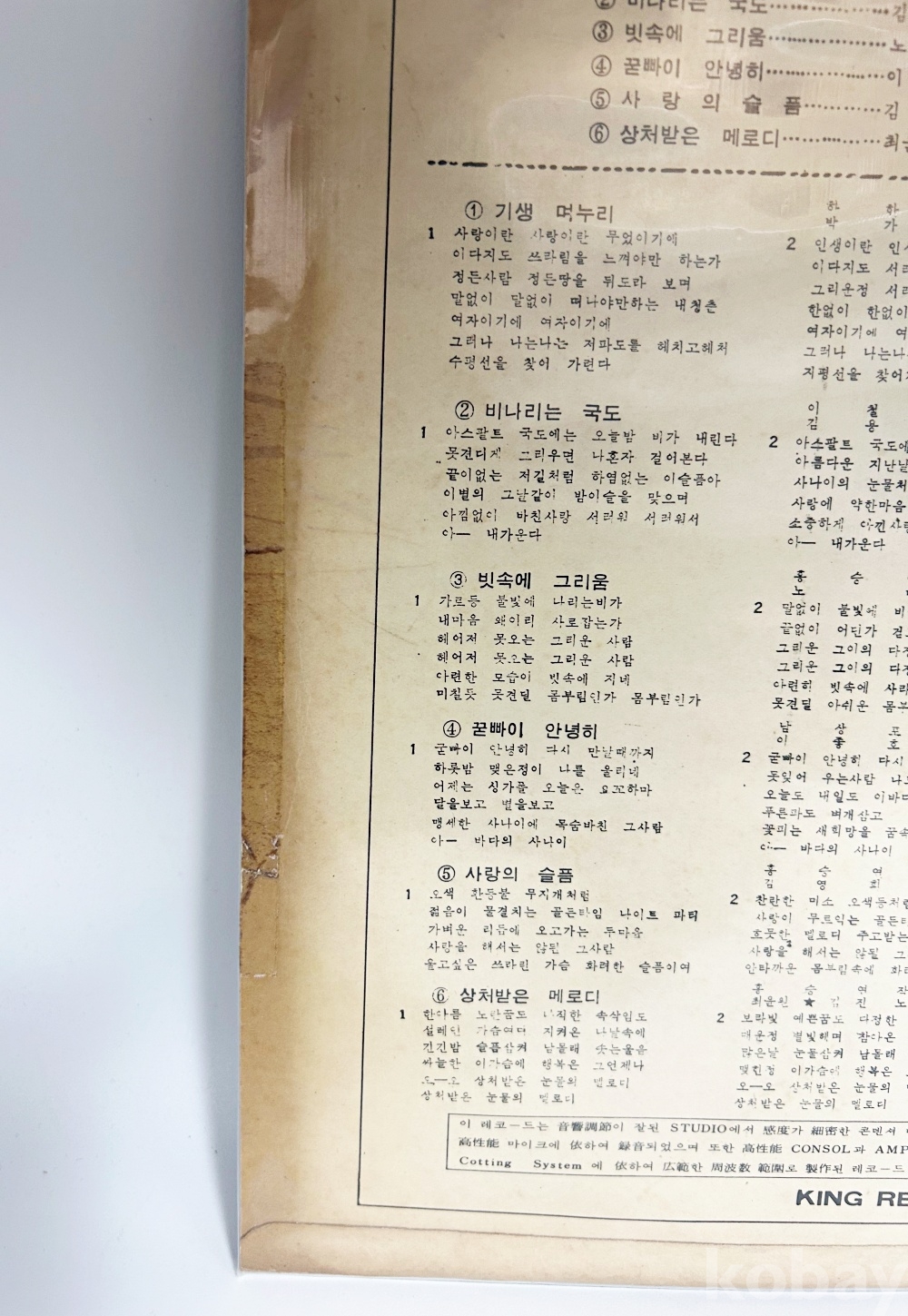 상품 설명 | Side A 1. 기생 며느리 (박가연) 2. 비나리는 국도 (김용만) 3. 빗속에 그리움 (노미) 4. 굳바이 안녕히 (이종호) 5. 사랑의 슬픔 (김영희) 6. 상처받은 메로디 (최윤원, 김진) Side B 1. 님도보고 뽕도따고 (김용만) 2. 이대로 죽고싶어요 (박가연) 3. 나그네 탄식 (서승일) 4. 청춘랑데부 (염문용) 5. 못견디게 그리워요 (손태랑) 6. 찔레꽃피는 내고향 (손도원) | ||
