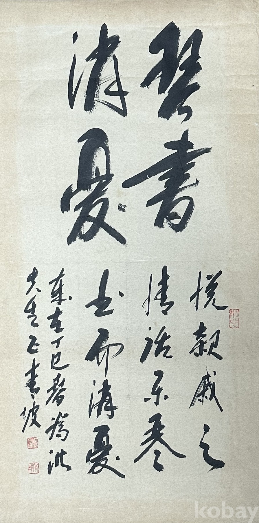 이 작품은 힘 있는 먹 선과 자연스러운 여백, 그리고 기품 있는 서체가 어우러진 동양 서예 족자입니다. 문인의 심성과 절제미가 느껴지는 한시(漢詩) 구절이 적혀 있으며, 작가의 개성 있는 서체와 단아한 낙관, 전각 인장이 함께 어우러져 작품의 품격을 한층 더합니다. 한국 서예 특유의 여백미와 필체, 정신성이 잘 반영되어 있어, 전통 서예 예술의 미학을 자연스럽게 감상하실 수 있습니다. 감성을 담은 글귀와 강렬한 붓의 힘, 그리고 고전적 감각이 조화를 이루는 본 작품은 공간에 동양적 분위기와 품격을 더해 줄 수 있습니다.