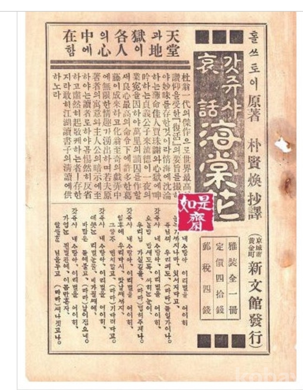광고 문안을 보면 원작자가 톨스토이이며, 박현환이 번역한 것이라는 사실을 알 수 있다.