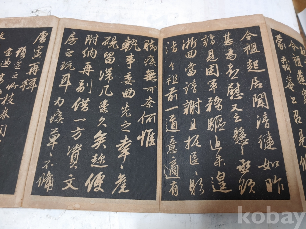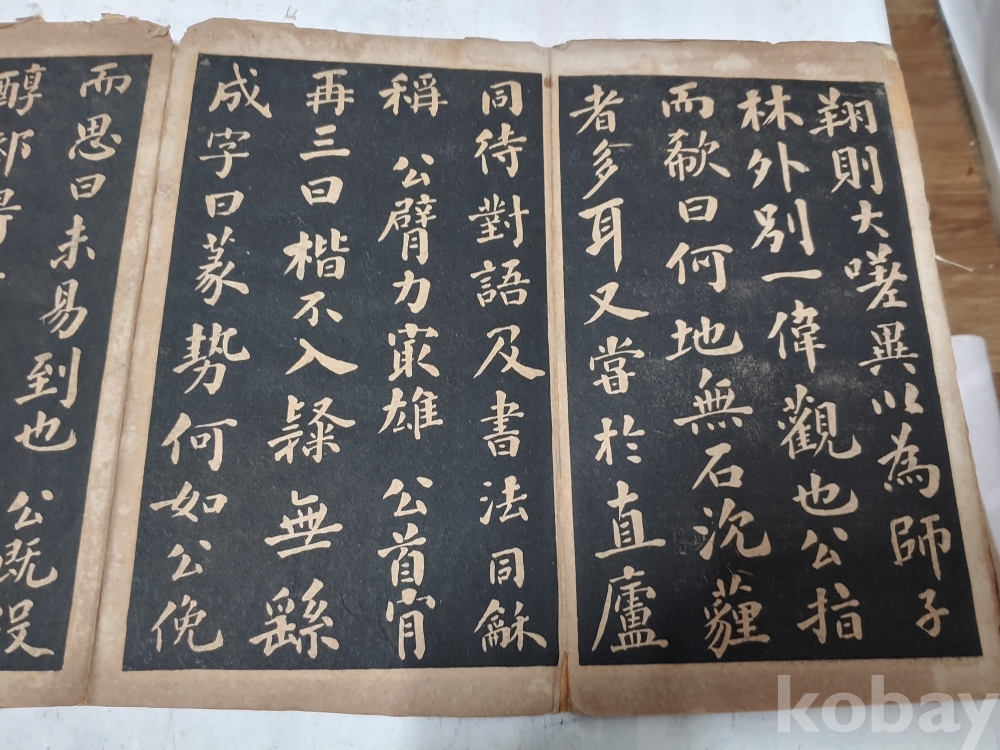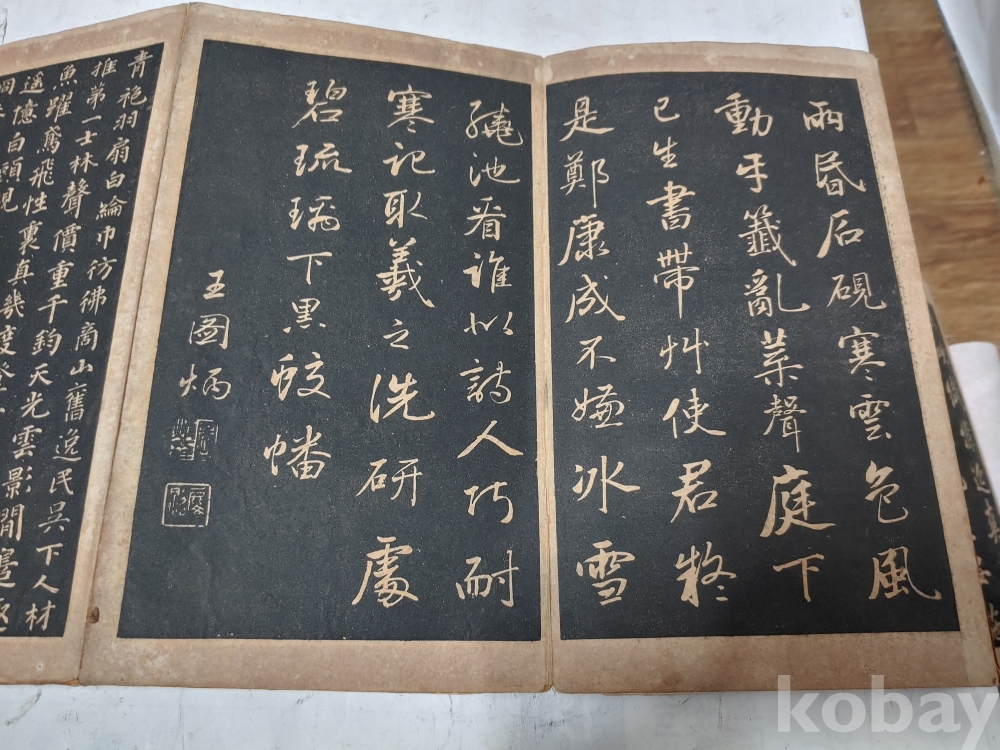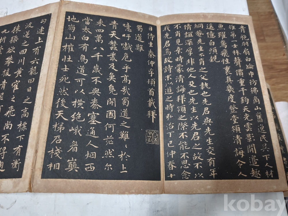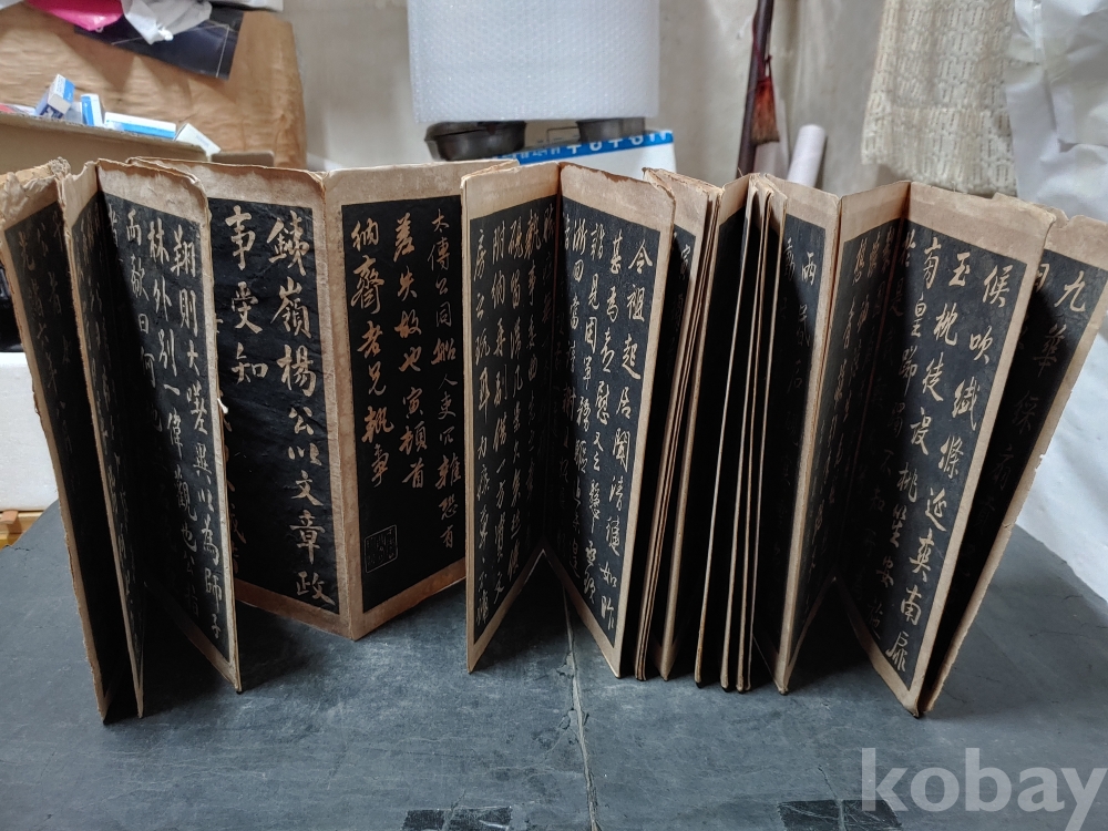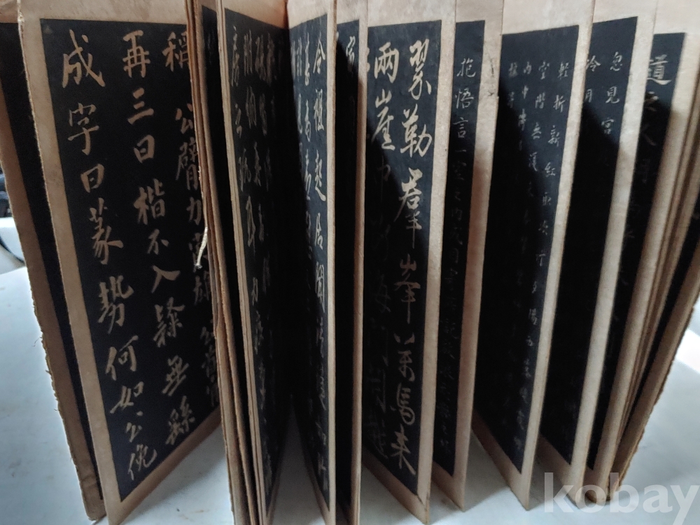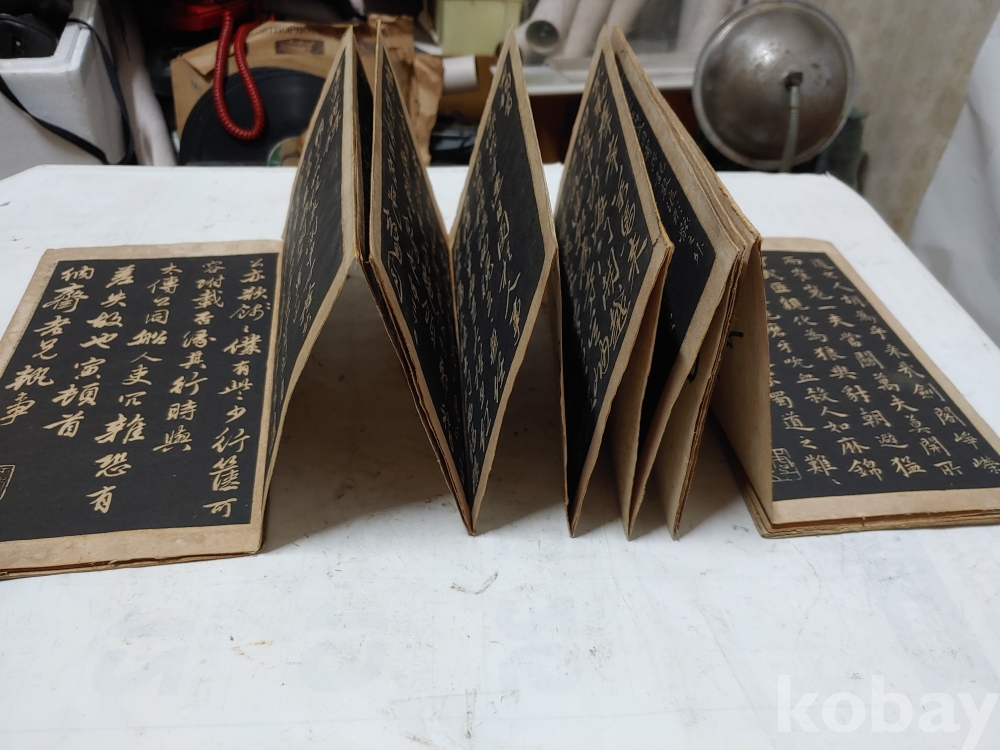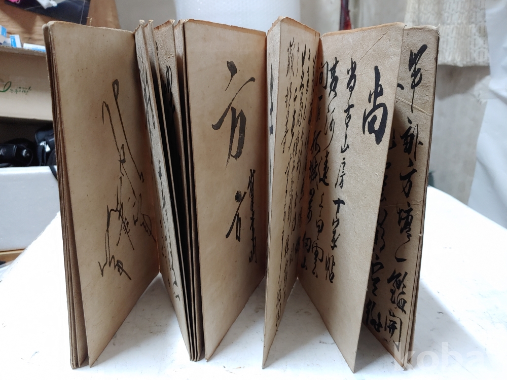 두꺼운 한지에 32면의 서첩이며 뒷면에는 필사체의 글씨가 있음