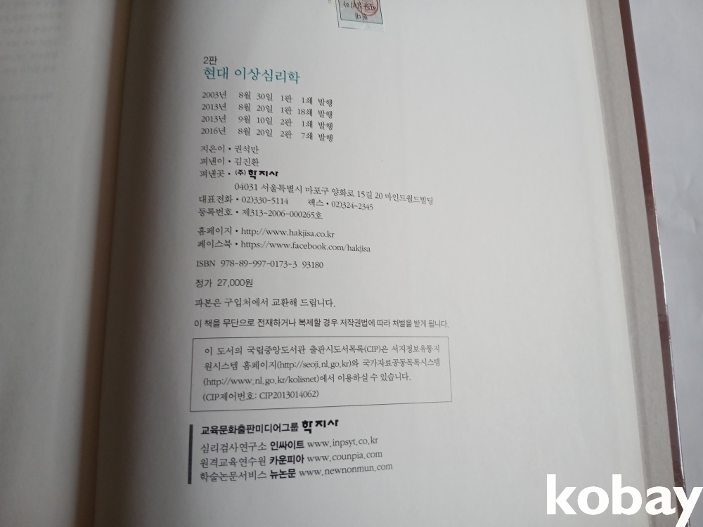 49-1) 현대이상 심리학 학지사, 권석만 저, 2016년