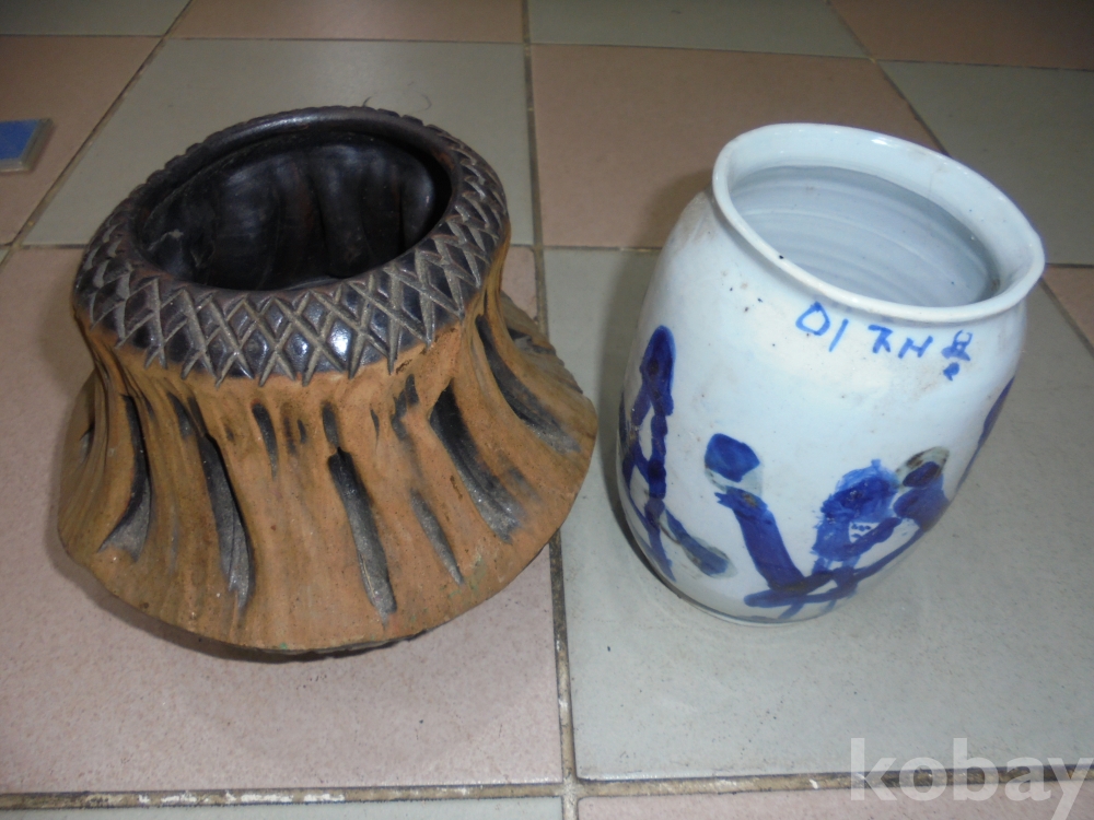 흑자항아리와 백자에 청화로 어린아이 바보그림이나 완전 예술성있는 성심 이재용 작가명있는 백자청화 항아리 총 2점