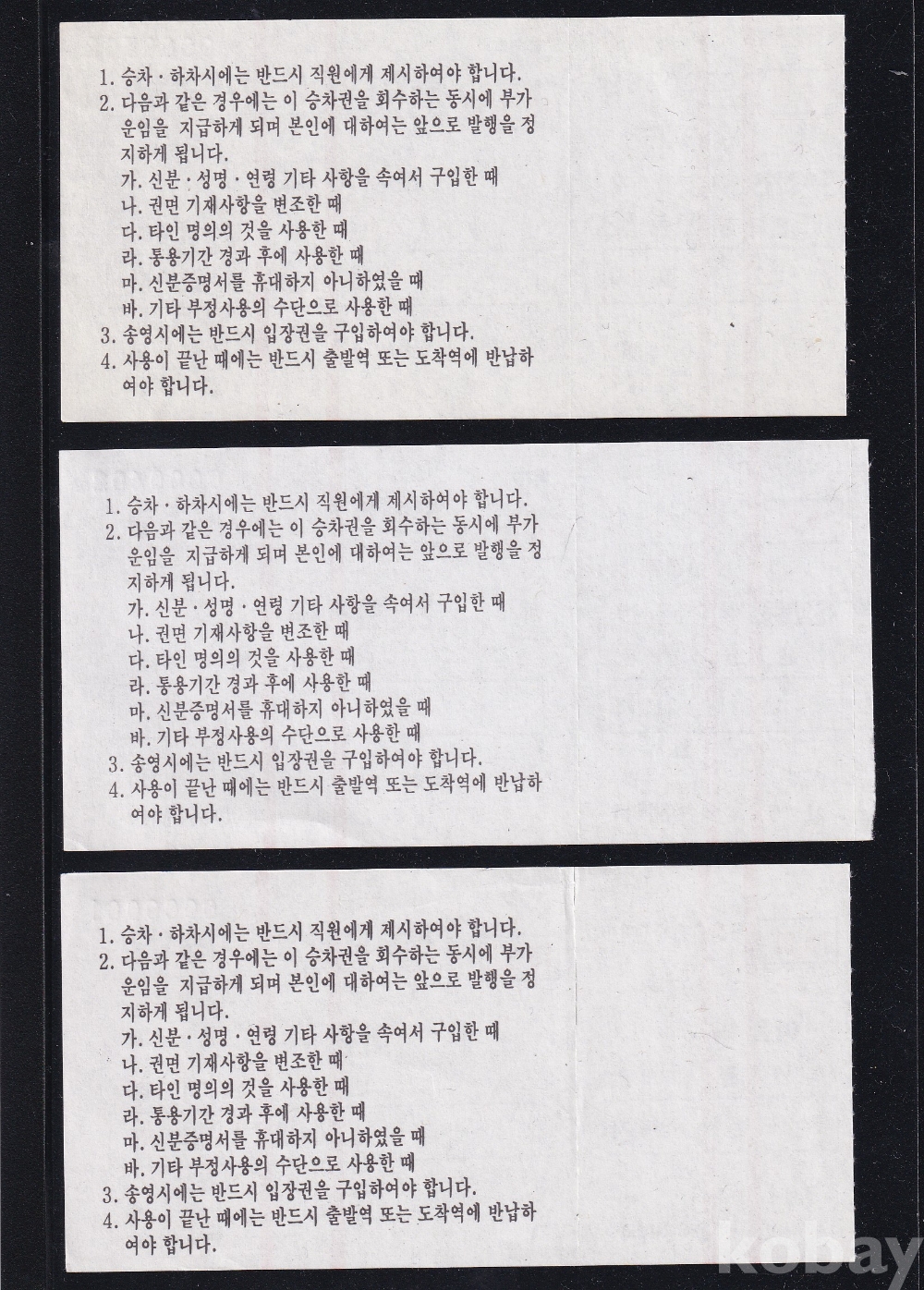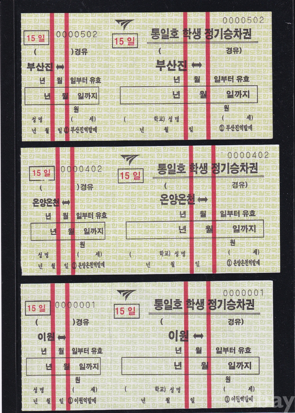 - [기차, 전철, 버스 승차권 모음展] - 통일호 학생 정기(15일) 승차권 3종 일괄