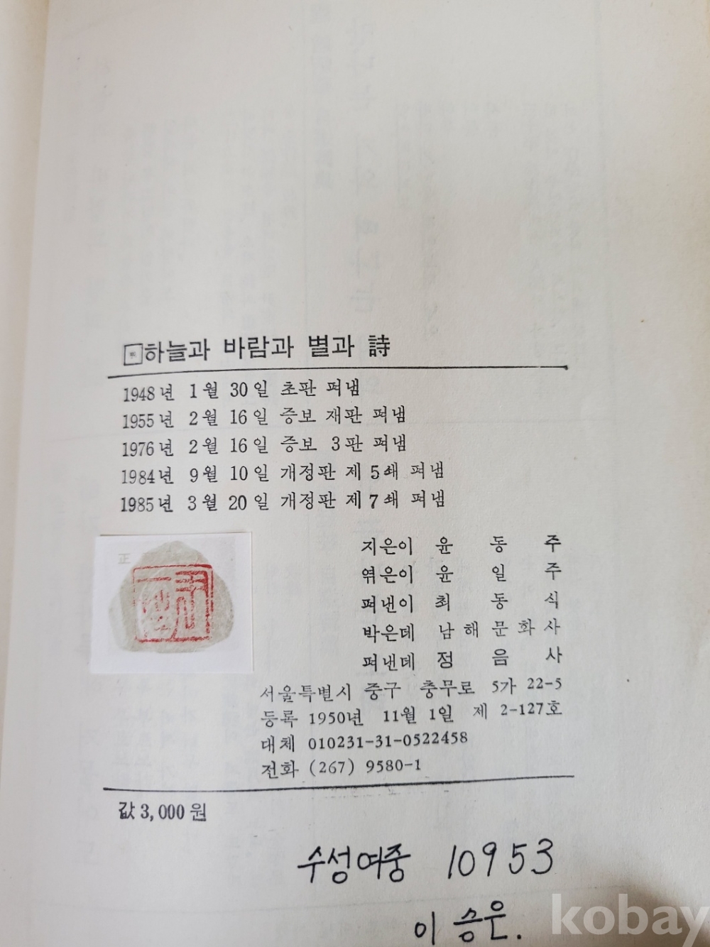 1. 하늘과 바람과 별과 시, 윤동주, 정음사, 1985년, 272쪽, 상태 상, 사진 참조