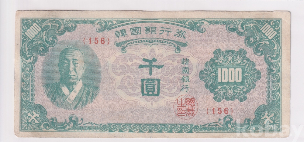 - 최초의 한국은행 천원권 이승만 한복 천원 일본인쇄 판번호 156번 극미 지폐