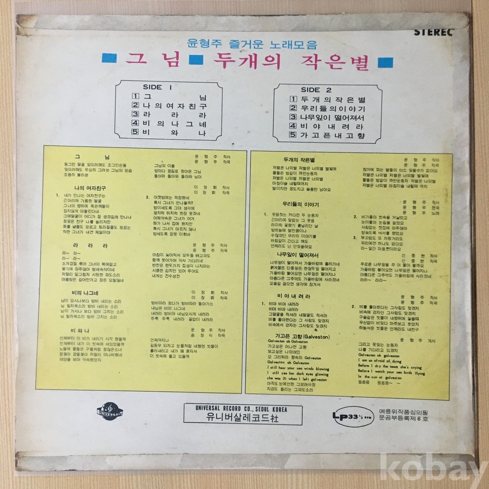 1. 그 님 2. 나의 여자친구 3. 라라라 4. 비의 나그네 5. 비와 나 | 1. 두 개의 작은별 2. 우리들의 이야기 3. 나무잎이 떨어져서 4. 비야 내려라 5. 가고픈 고향 (Galveston) |