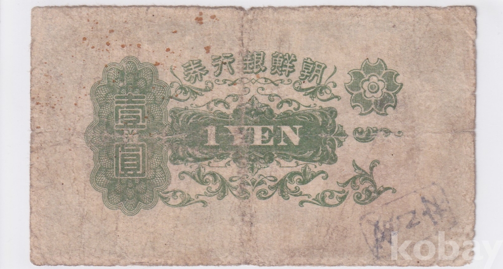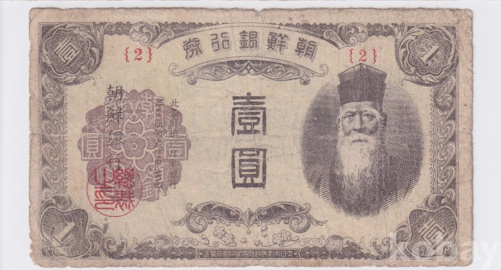 - 조선은행 1945년 을 일원 판번호 2번 사용제 지폐