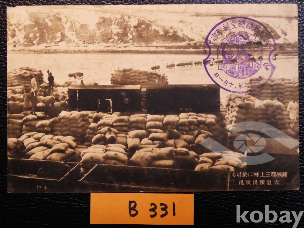 ▣근대한국 엽서(진본): 함경북도 종성군에 있는 삼상봉에서 대두를 유출하는 광경, 대두(콩)를 기차로 유출하는 모습.