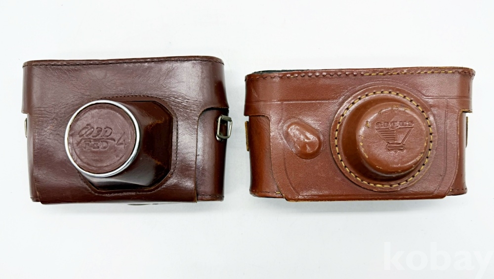 상품설명 | 1. 미국 'ARGUS' 카메라 가죽 케이스 / 17.5 x 9 cm / 가죽끈 유실, 똑딱이 버클 가죽 유실 2. 구소련 'FED 4' 카메라 가죽케이스 / 15.5 x 11 cm