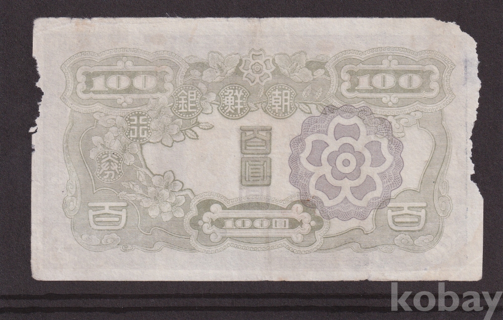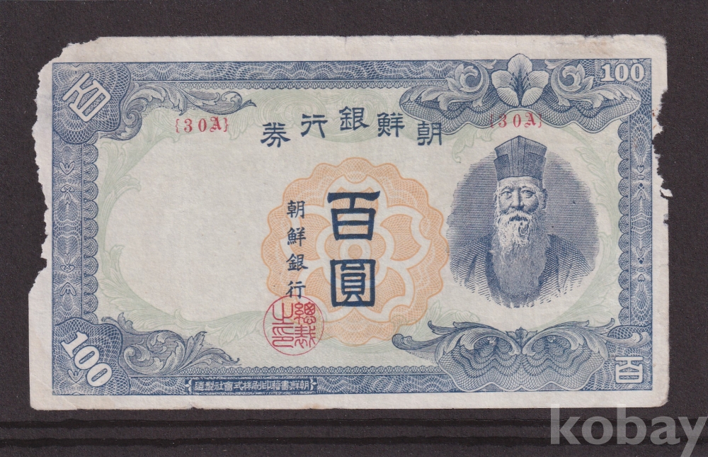 - 조선은행 무백원 황색지 판번호 30A 사용제 지폐