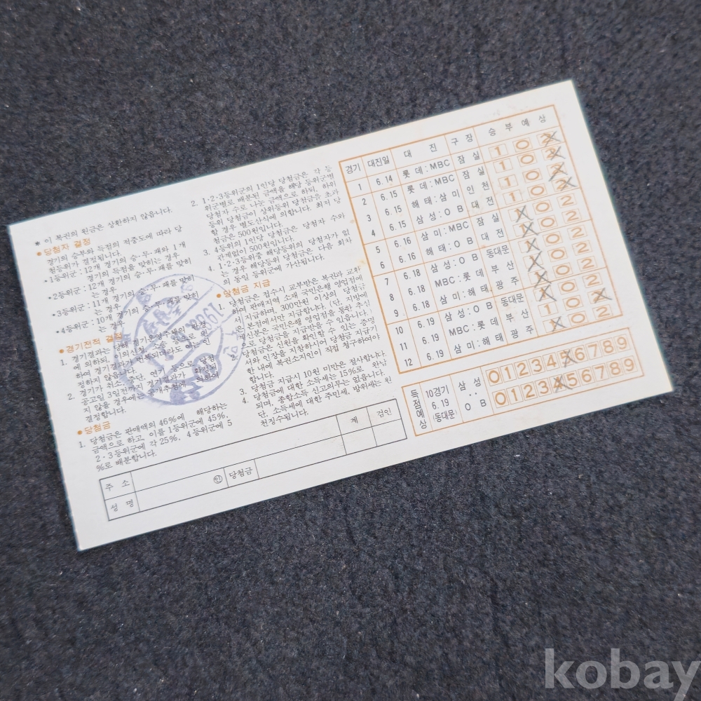 (((프로야구자료/야구복권/호돌이))) 1985년 야구복권 (제12회) (롯데 유두열)