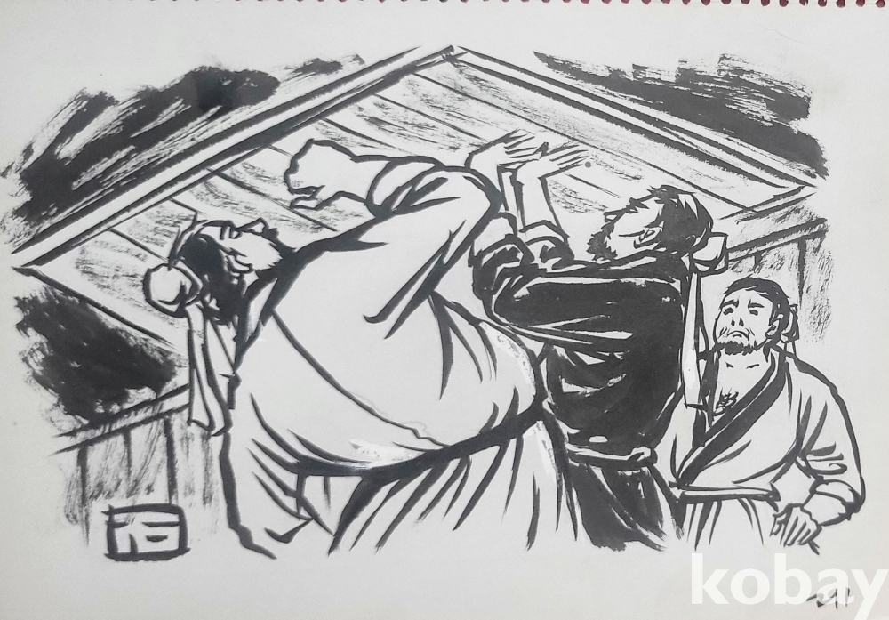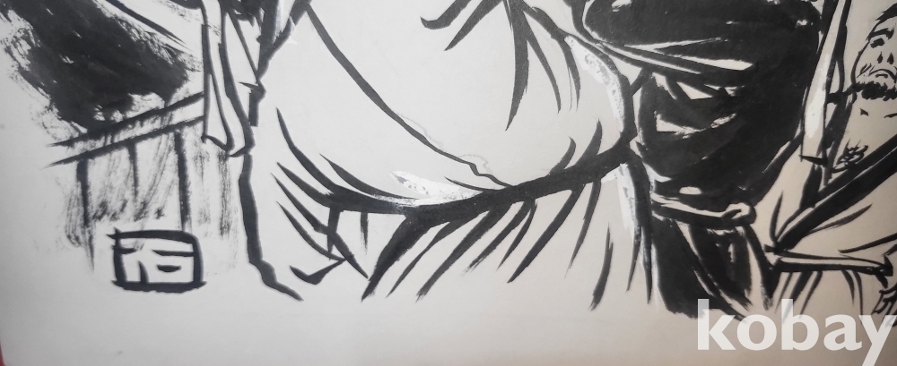 물과 먹으로 만 직접 그려진 수묵화 삽화입니다,