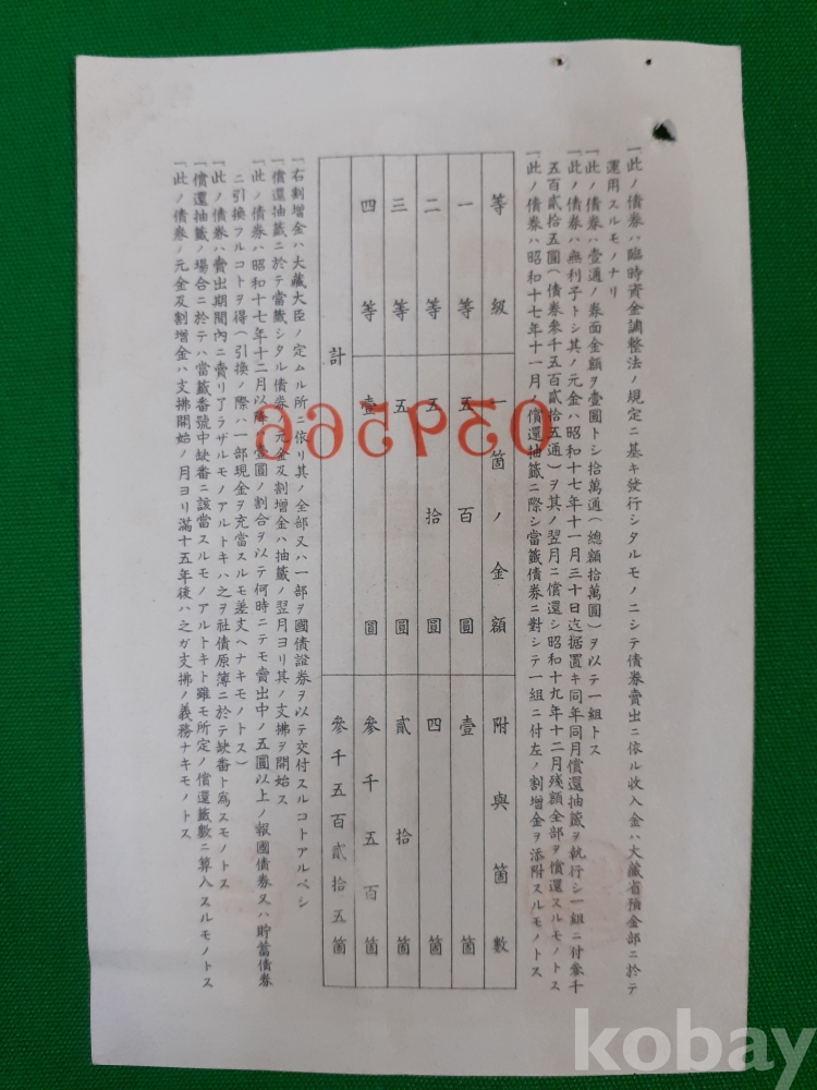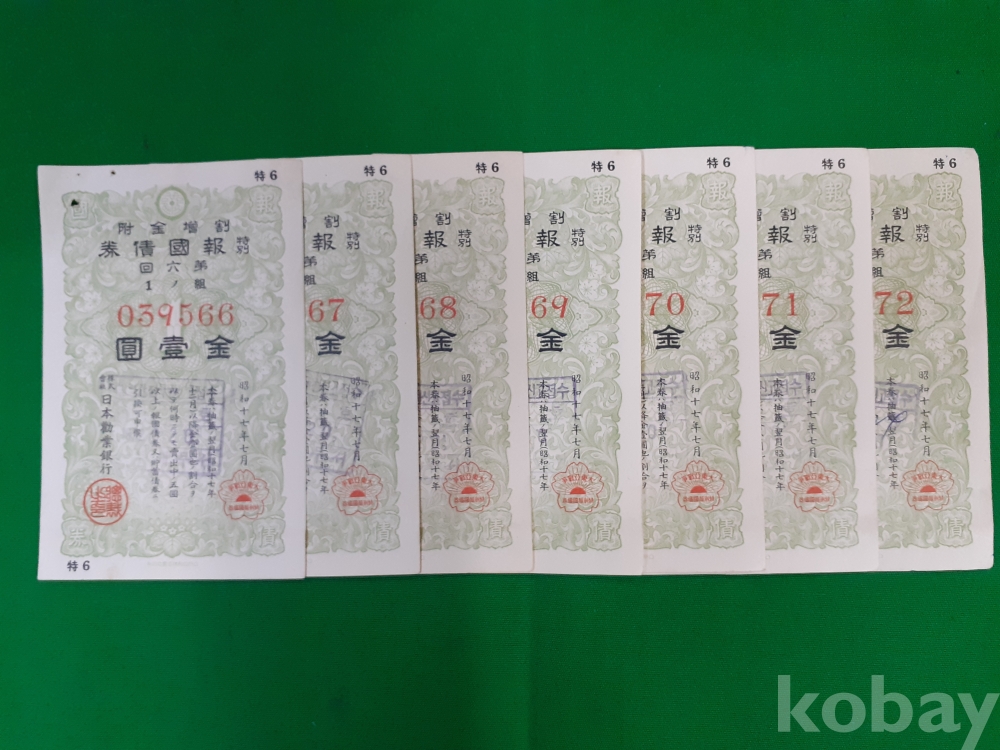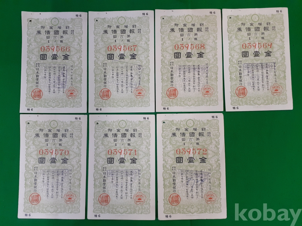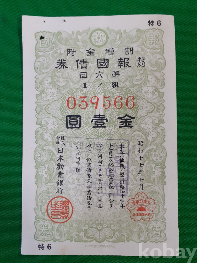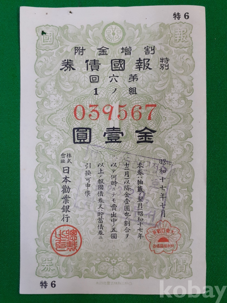 쇼와 17년(1942년)에 일본 권업은행에서 발행된 '특별보국채권(特別報國債券)'으로 제2차 세계대전 당시 일본 정부의 전쟁 비용 조달을 위해 발행된 국채의 일종입니다.