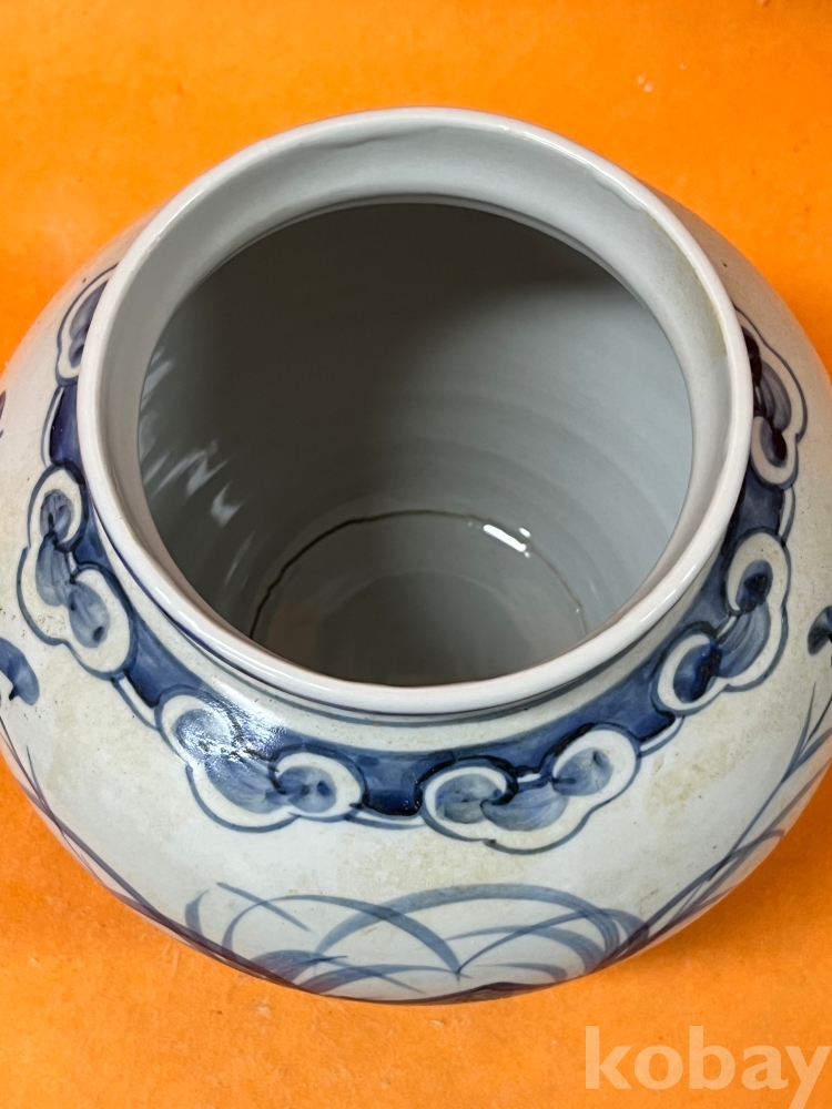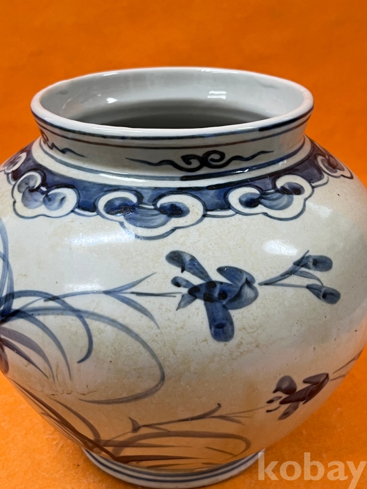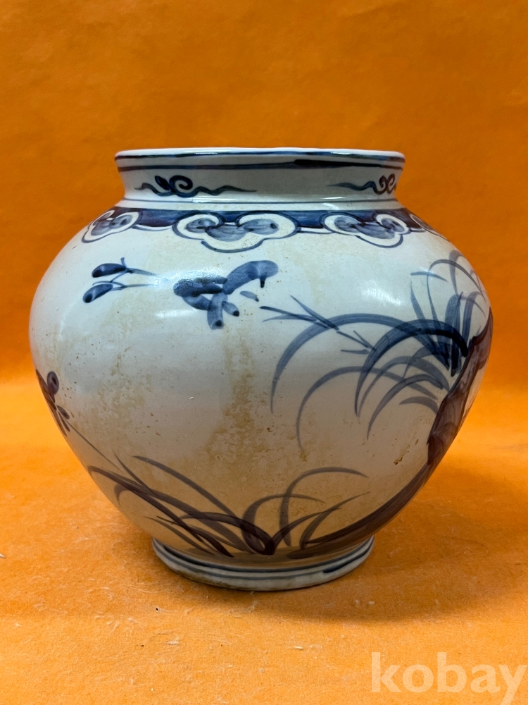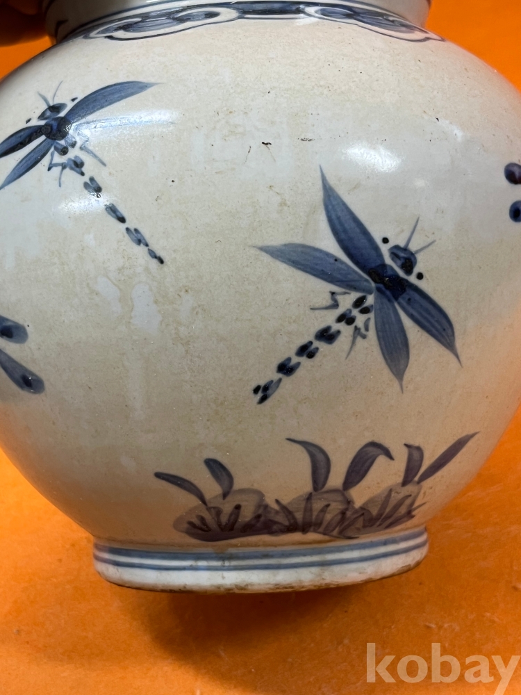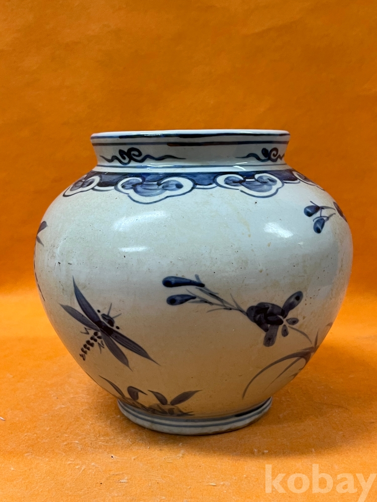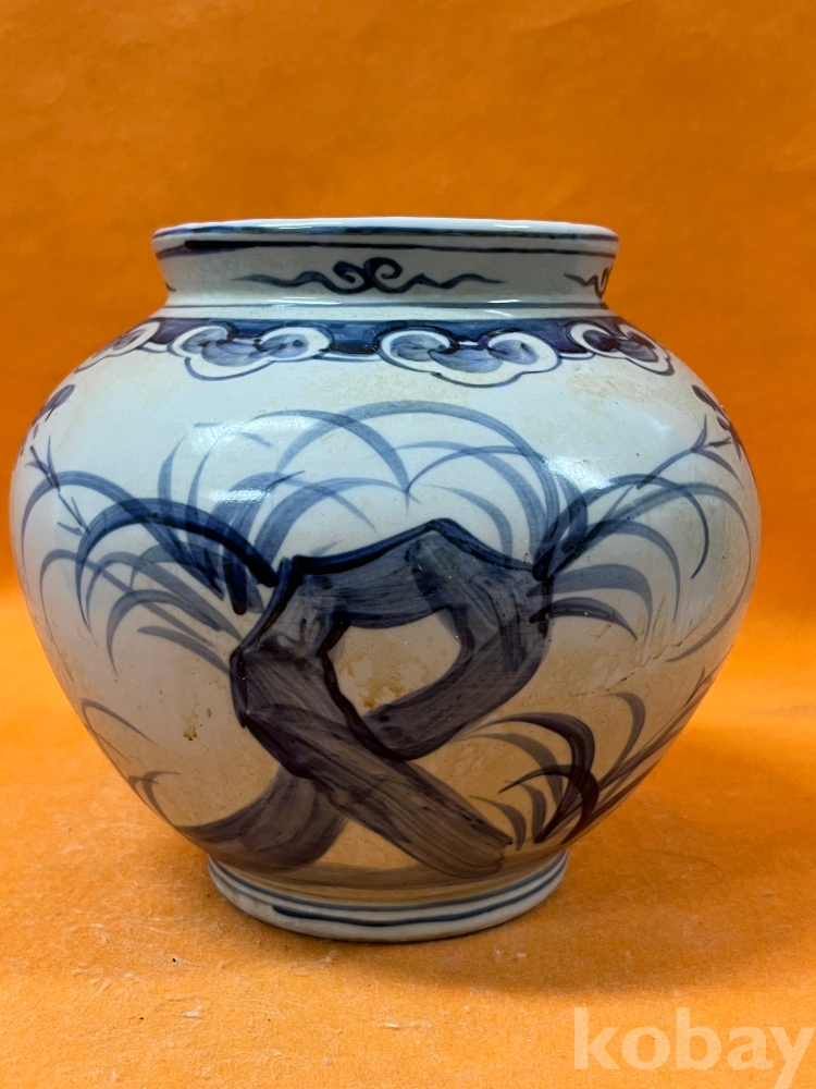 이 항아리는 백자 위에 청화 안료(코발트)를 사용하여 송죽(松竹)과 잠자리를 그린 작품입니다.