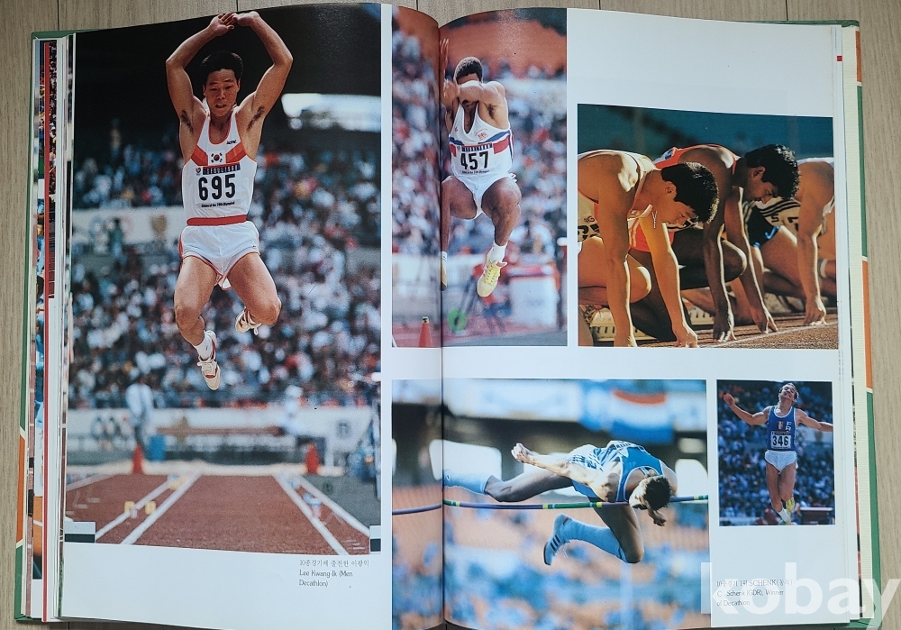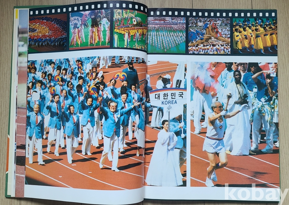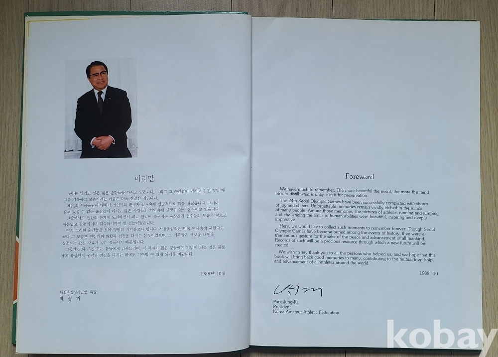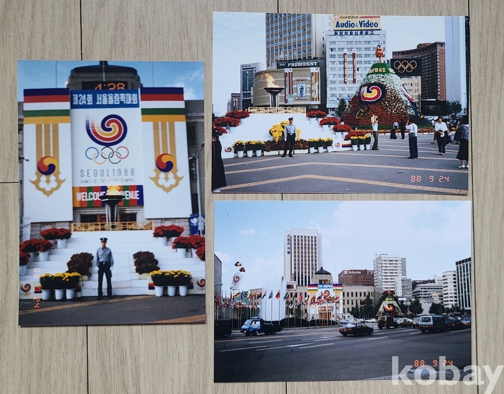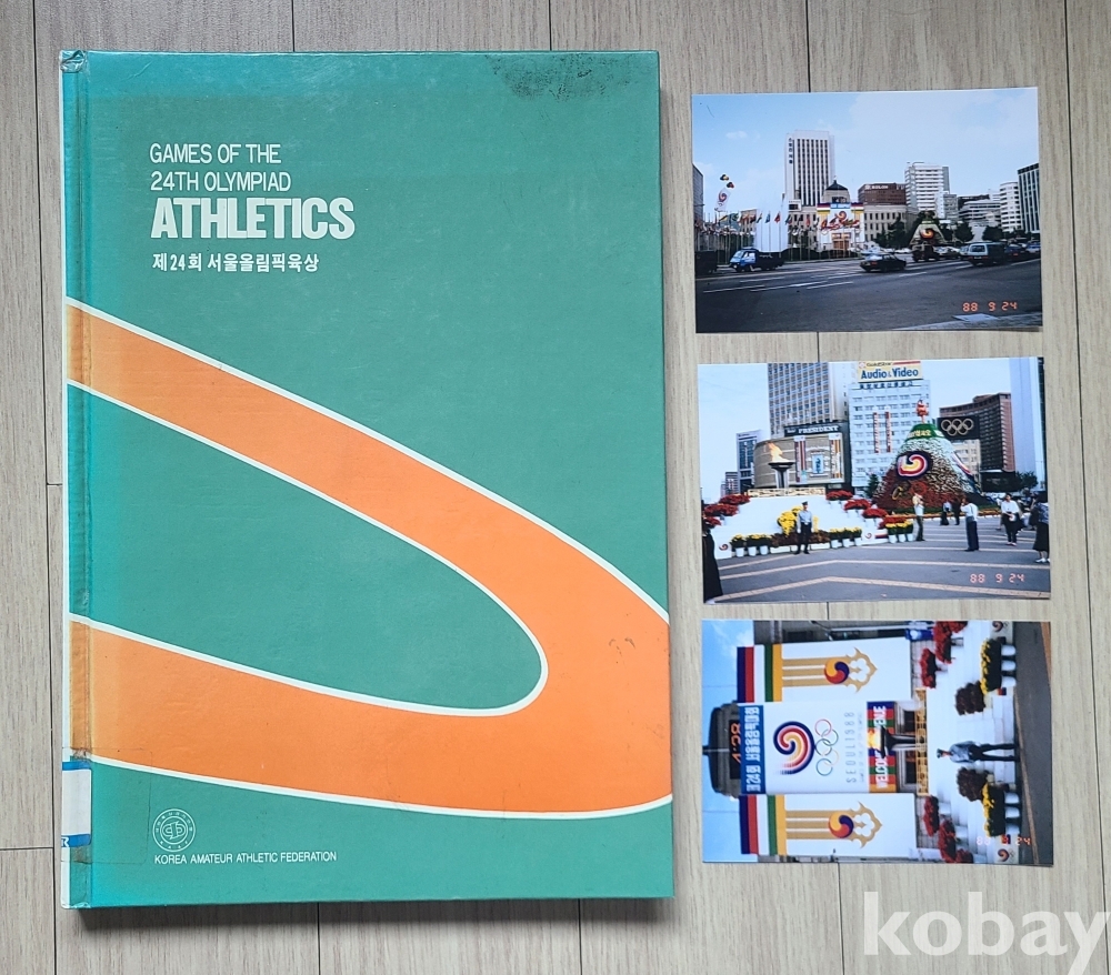 대한육상연맹 박정기 회장이 원자력연구소장 한필순 박사에게 증정한 싸인본과 올림픽 기간중 시청앞 올림픽 조형물 사진 3장.