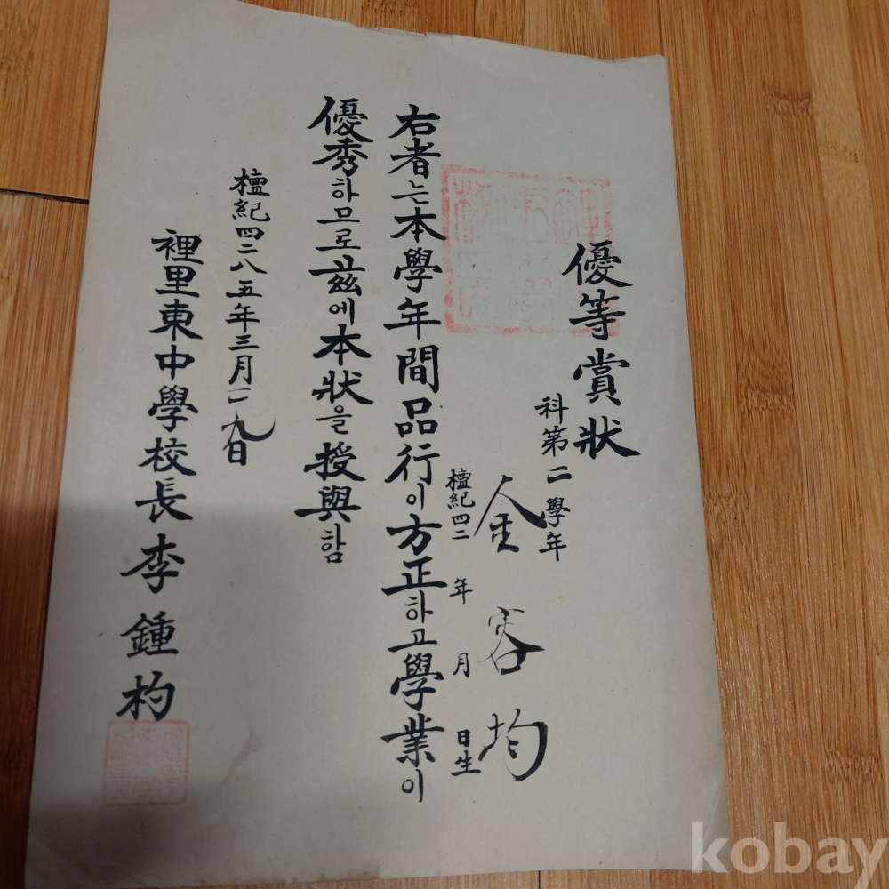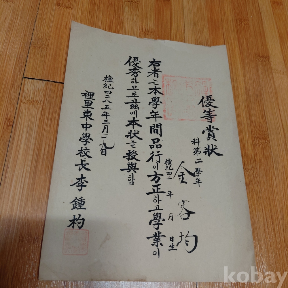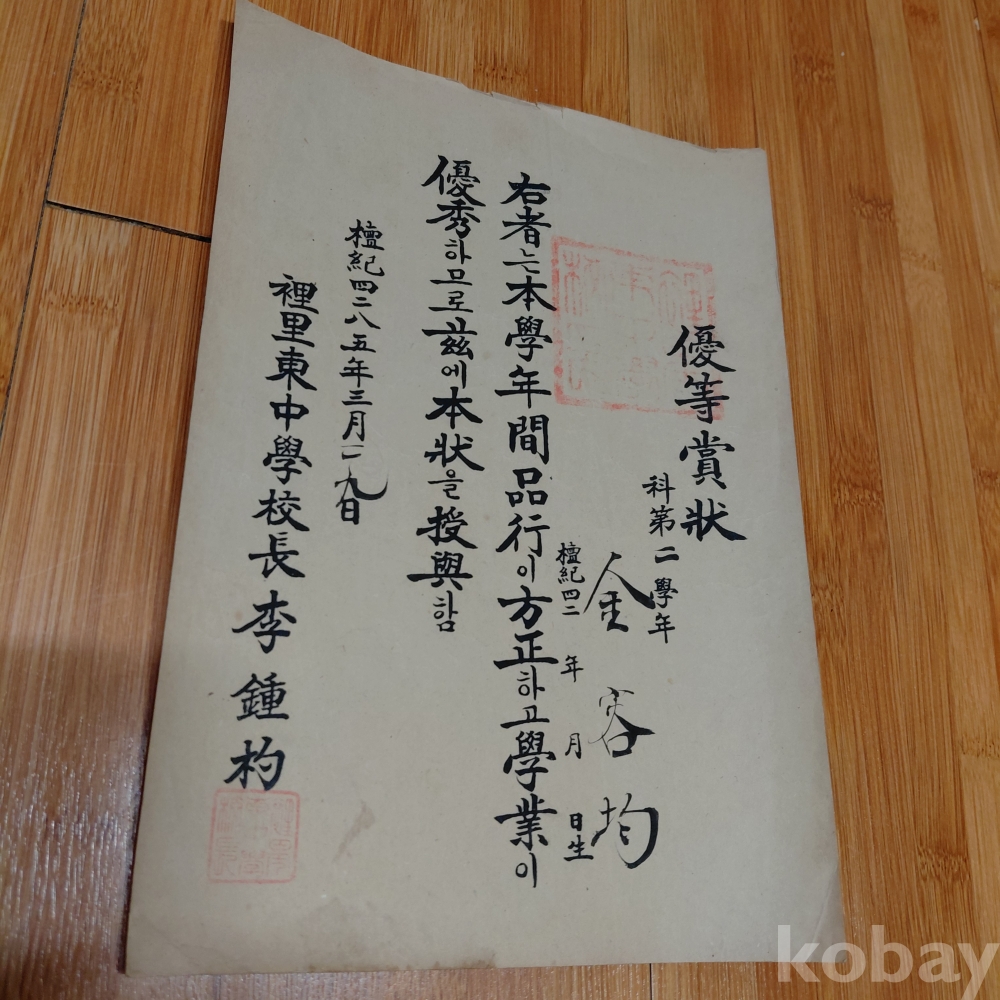 단기 4285년서기1952년 이리동중학교 상장귀한자료 한점 올려드립니다