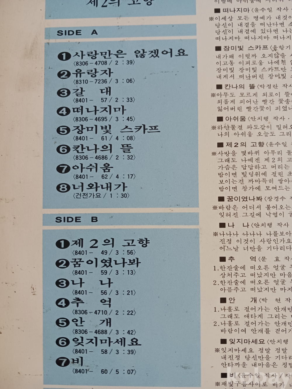 자켓상태 | EX : 약간의 마모, 모서리 찢김 존재 | 음반상태 | NM : 개봉했으나 미사용급, 스크래치 없음 | 발매정보 | 초반 | 가사지여부 | 무 |