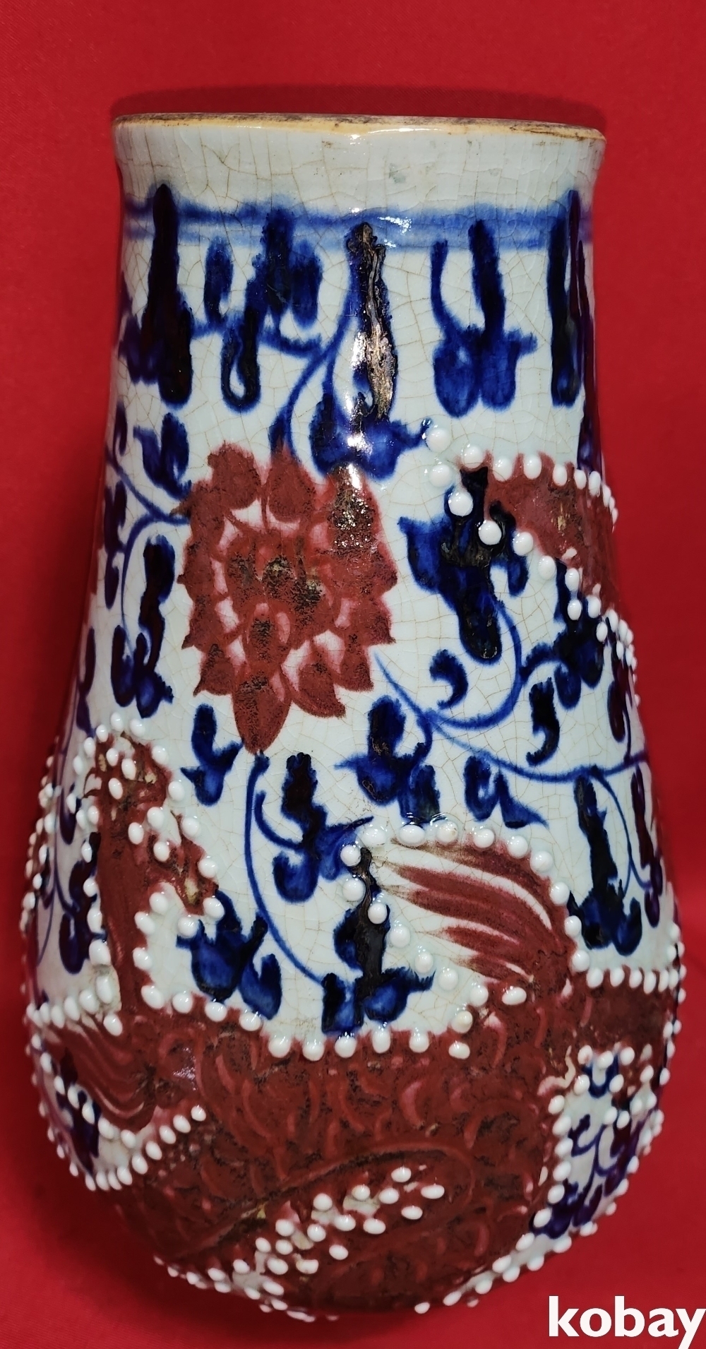 대원국지정8년제 관지가 어깨선에 보이는 청화 유리홍 홍용(紅龍)문 매병입니다,