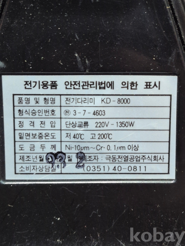 1993년 전기 다리미 모델 KD 8000 220볼트 정상작동 11*23*10