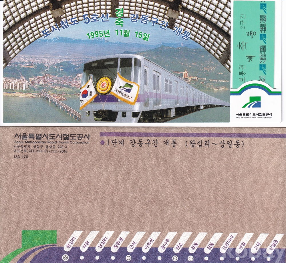 - 1995년 11월 15일 서울도시철도 5호선 강동구간(왕십리~상일동) 개통 기념 보통권 승차권 - 봉투포함