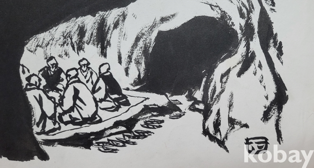 ### 스케치 북에 그린 것으로 어떤 삽화 뒷면에는 1984ㅡ5년 8월 ㅡ10월등의 날인(日印)이 있읍니다,