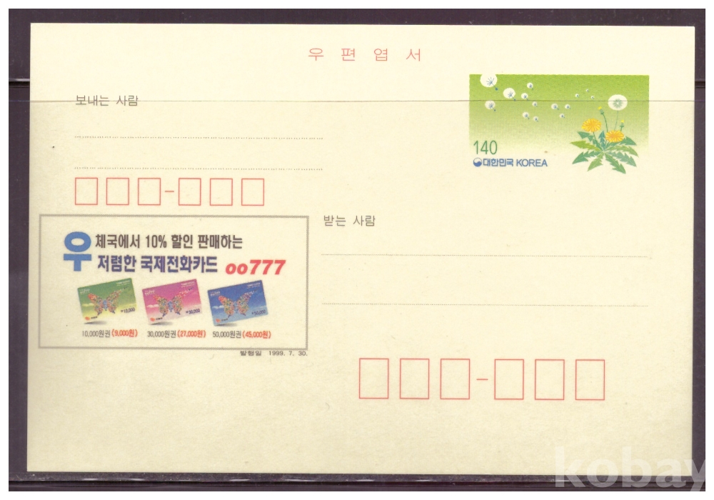 (광고엽서) 1999.7.29 지방판 LAPC347 서울국제전화 (민들레 140원)