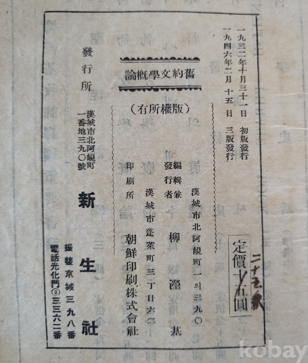 1946년 경성 신생사 발행 ‘구약문학개론’ 이며