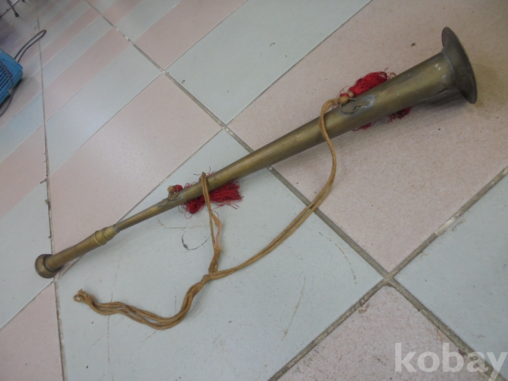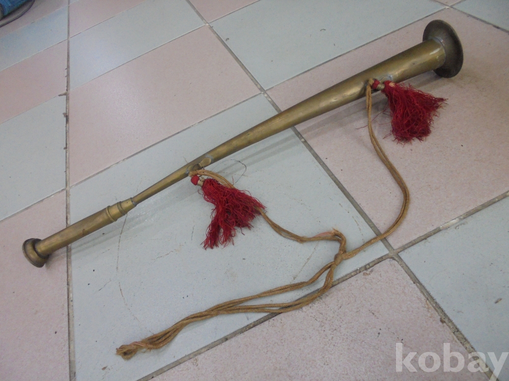 길어서 불면 소리가 깊고 울령차게 크게잘나오는 개화을 일깨우며 기상시키던 오래된 온전한 소리잘나는 오래된 유기 기상나팔
