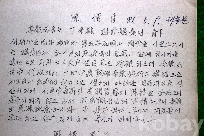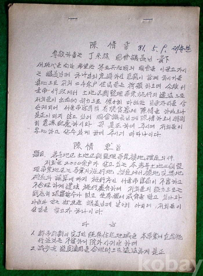 (진정서) 1981년 국회의장에게 보낸 강동구 암사지구 토지구획정리에 관한 진정서 1점