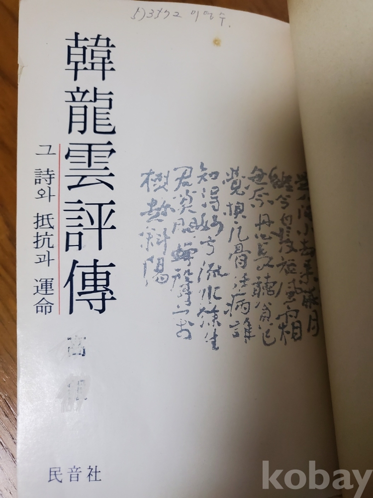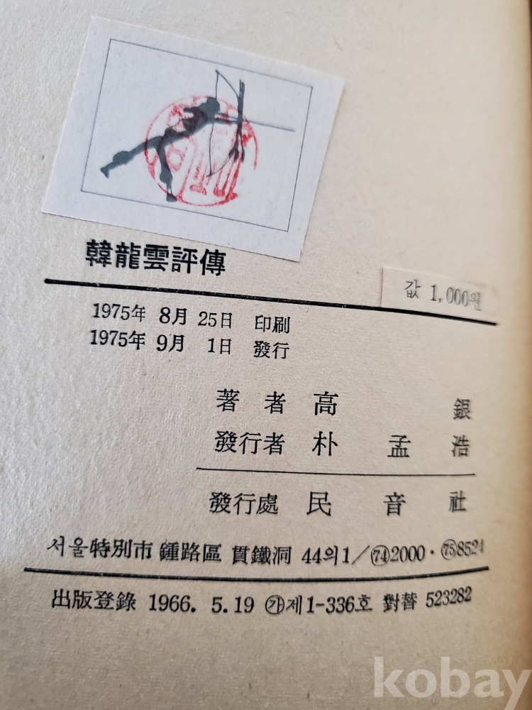 1. 한용운평전, 고은, 민음사, 1975년, 401쪽, 상태 상, 사진 참조