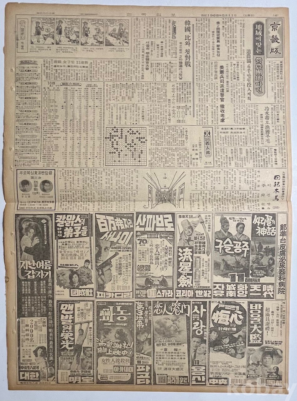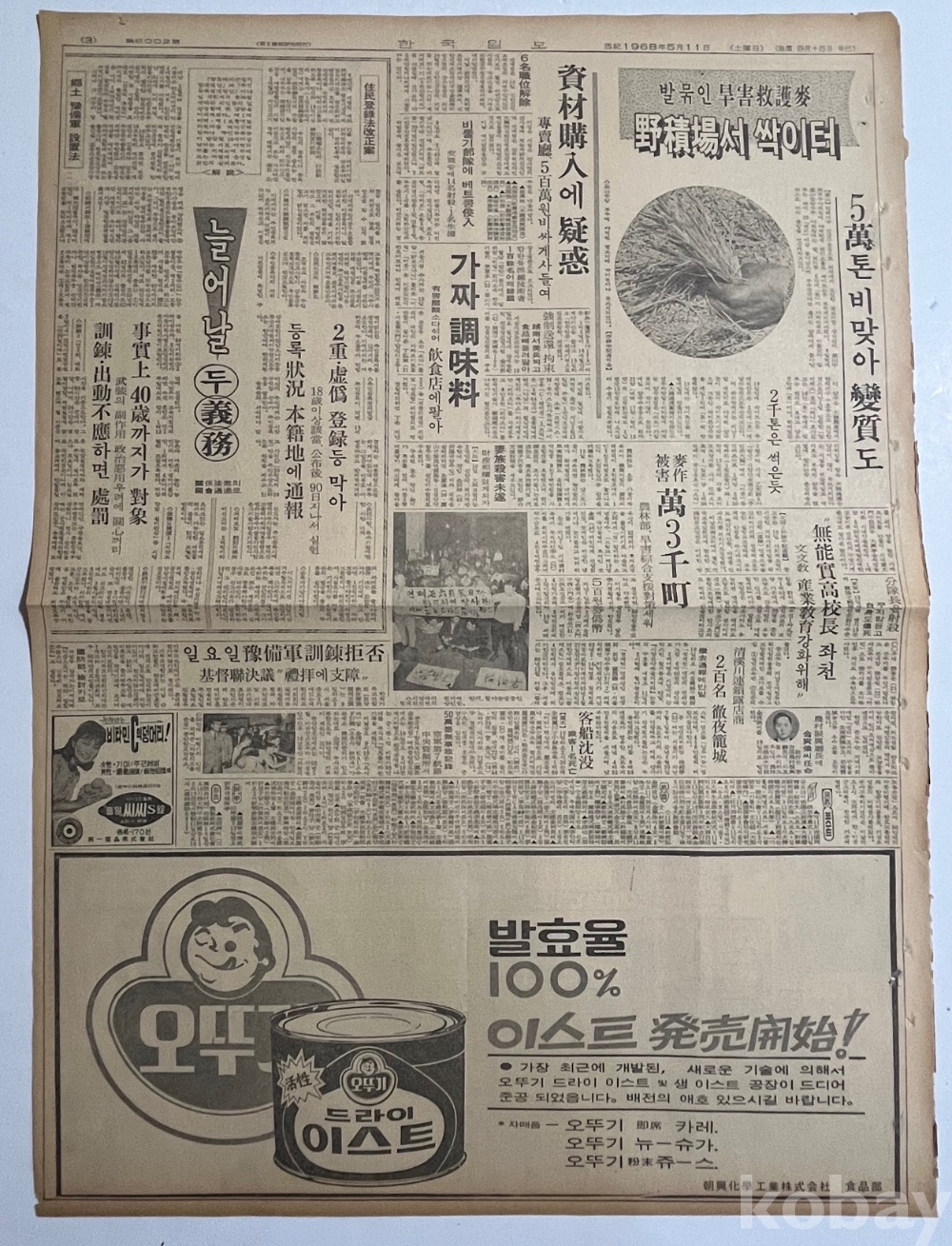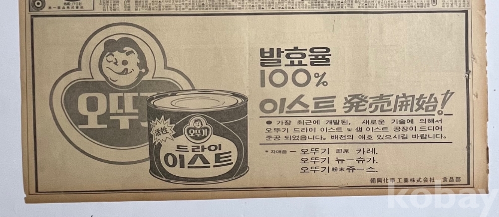 오뚜기 이스트 광고가 실린 1968년 한국일보 낱장입니다.