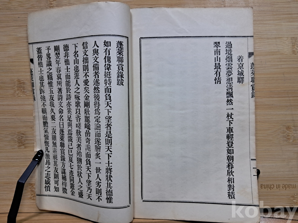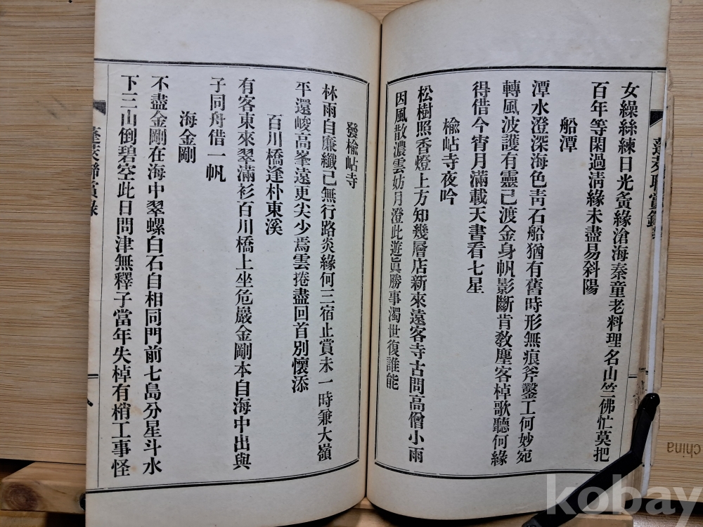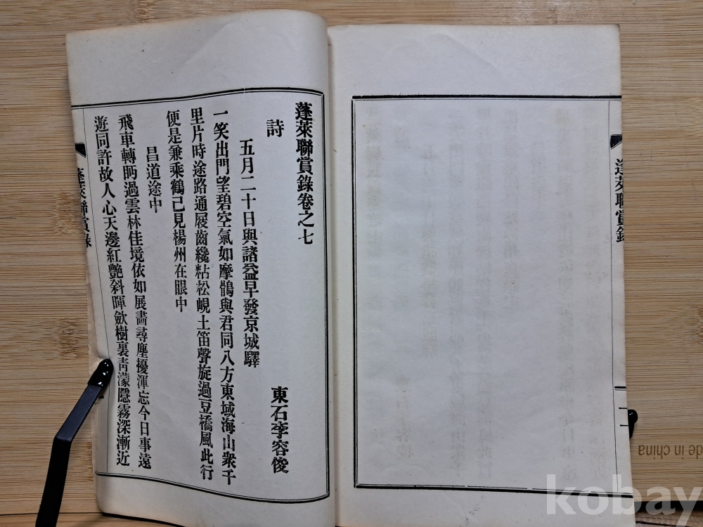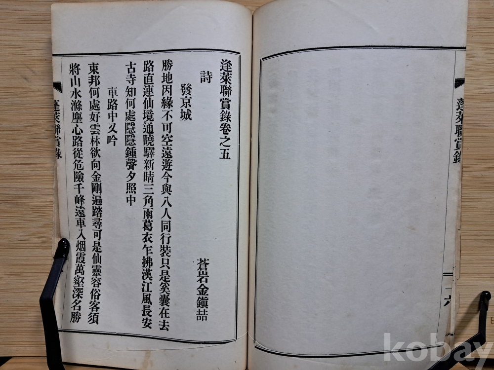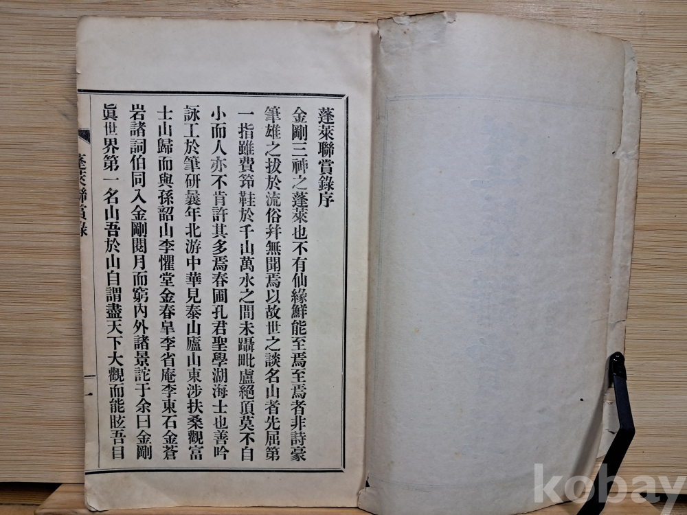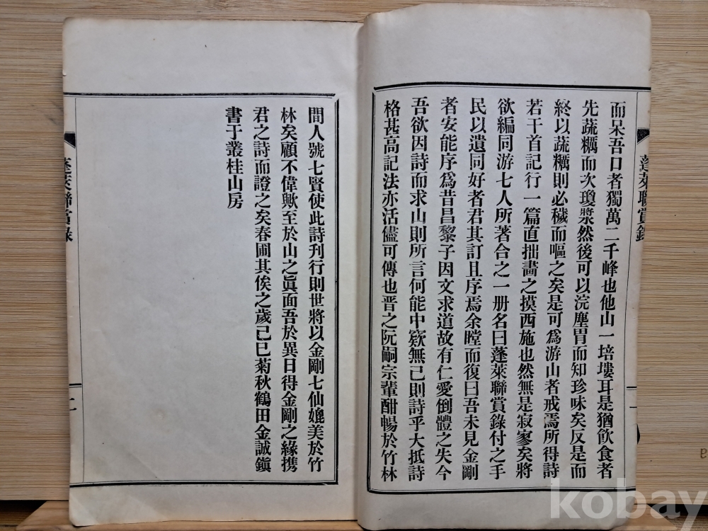 | 소산(韶山) 손봉상(孫鳳祥), 창암(蒼巖) 김진철(金鎭喆), 춘고(春皐) 김근용(金謹鏞), 구당(懼堂) 이범성(李範星), 춘포(春圃) 공성학(孔聖學), 성암(省庵) 이기소(李基紹), 동석(東石) 이용준(李容俊) 等 7명의 1929년 금강산 기행을 엮은 [봉래연상록(蓬萊聯賞錄)] 新鉛活字本 7卷 單冊으로 권두에 '己巳(1929)菊秋金誠鎭書', 권말에 '崔在道'의 발문이 있다. 본문 두 장 약간 갈라짐, 표지 약간 손상 외 상태 양호하다. |