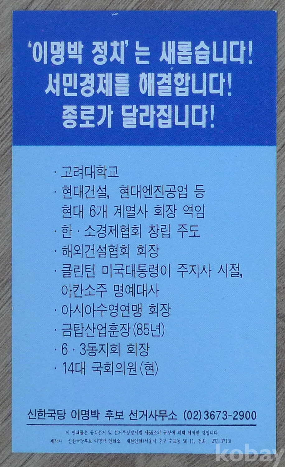 1996년 제15대 국회의원 선거 신한국당 이명박 후보 홍보 명함