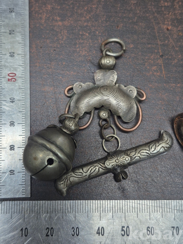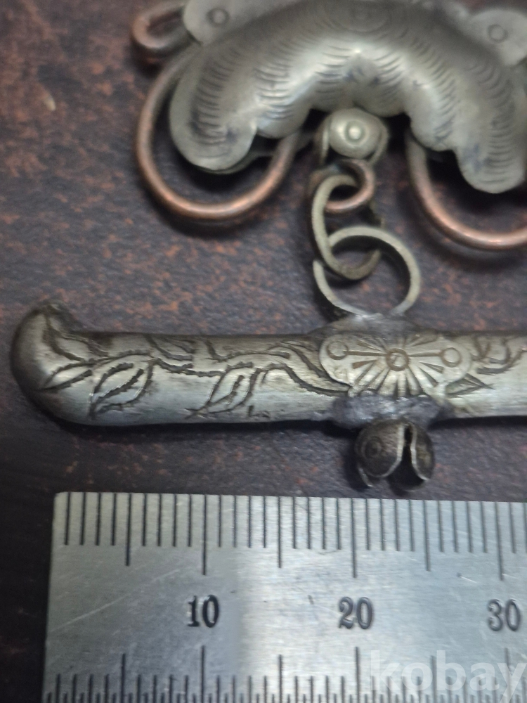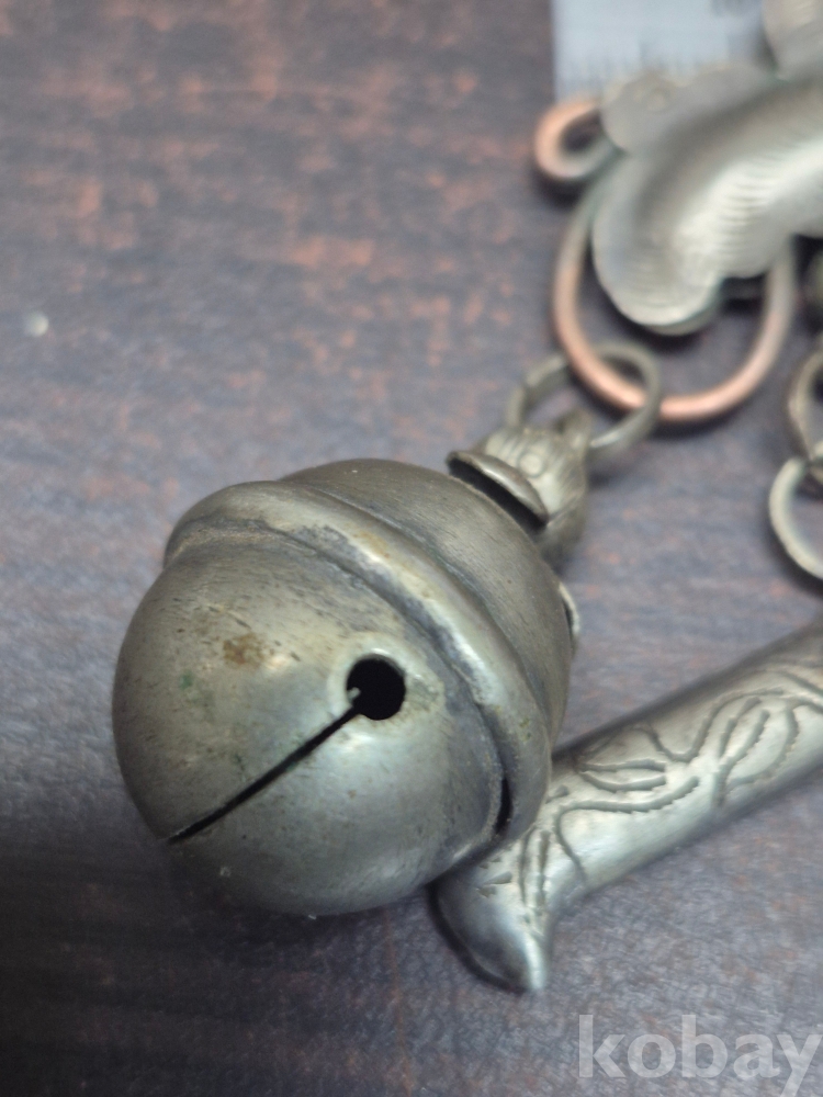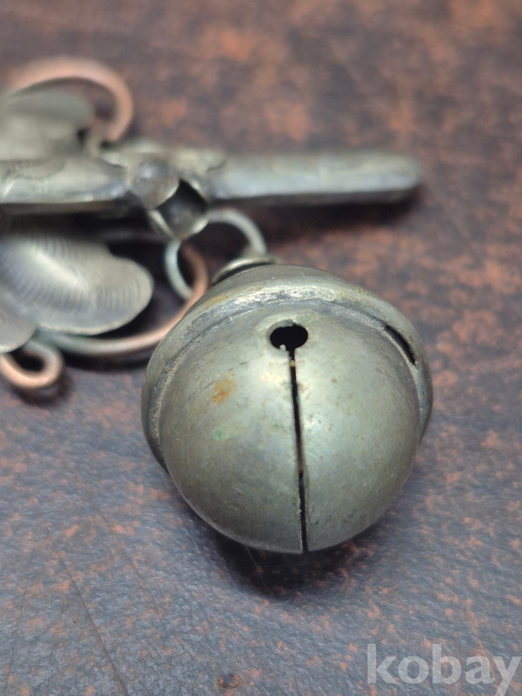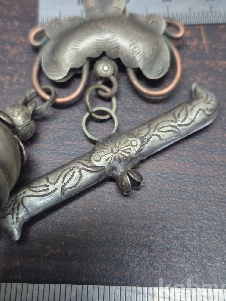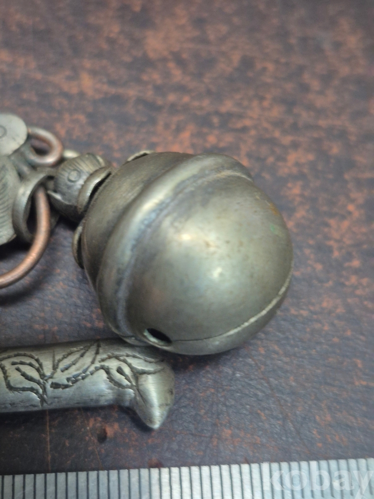 작은 백동인지 은인지 모를 재질로 만들어진 은장도 모양 방울 모양 장식품 정교하게 세공되어 있는 작품 장식품 6*6*2