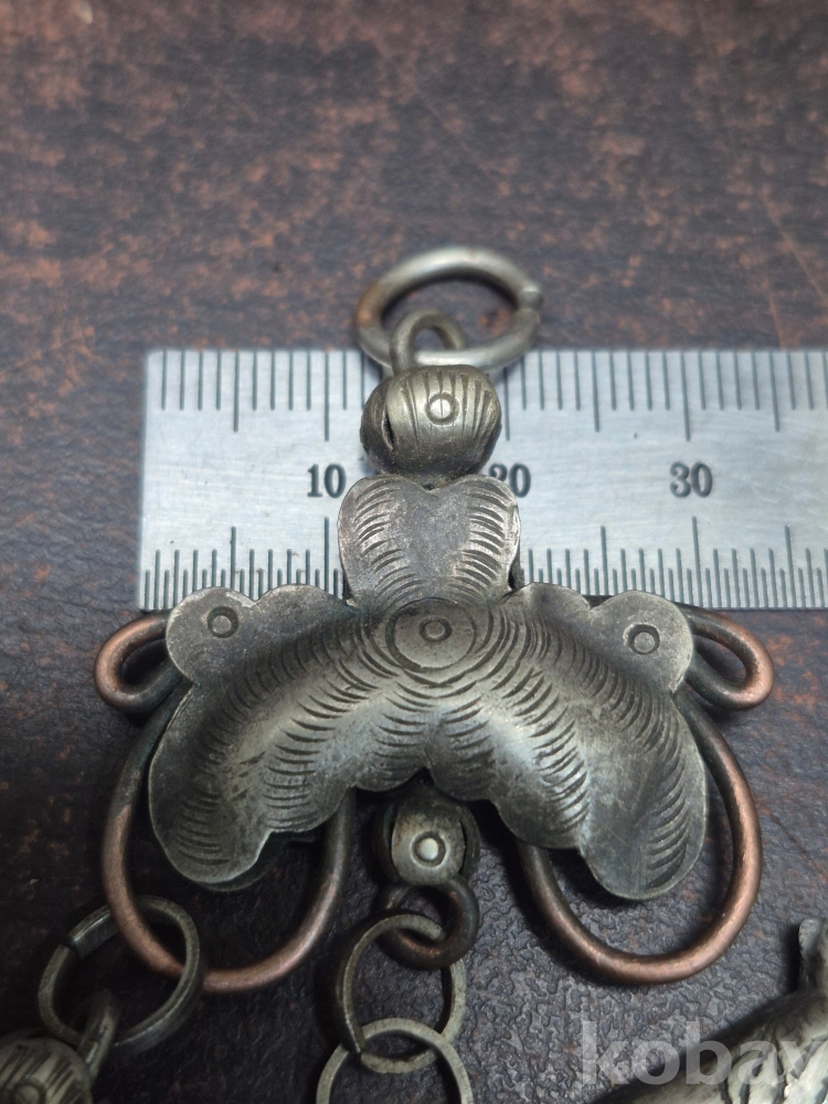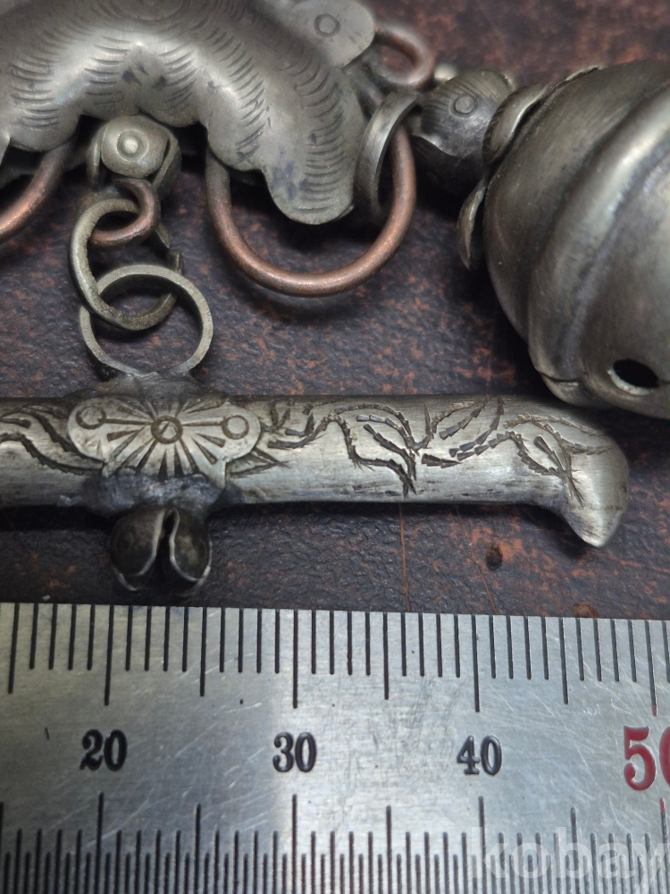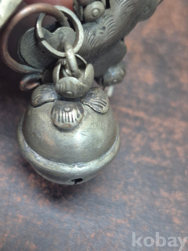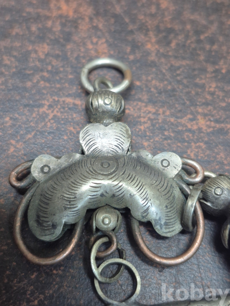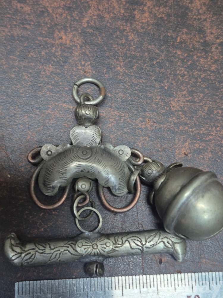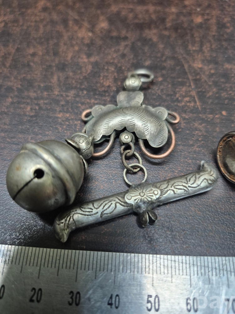작은 백동인지 은인지 모를 재질로 만들어진 은장도 모양 방울 모양 장식품 정교하게 세공되어 있는 작품 장식품 6*6*2