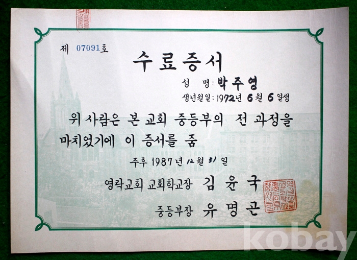 (상장 및 졸업장) 1987년 영락교회의 중등부 전과정 수료증서