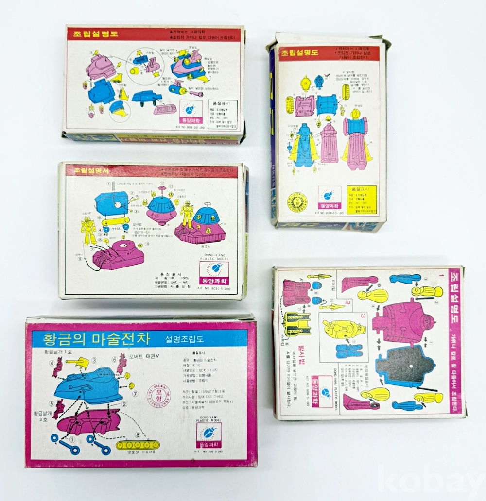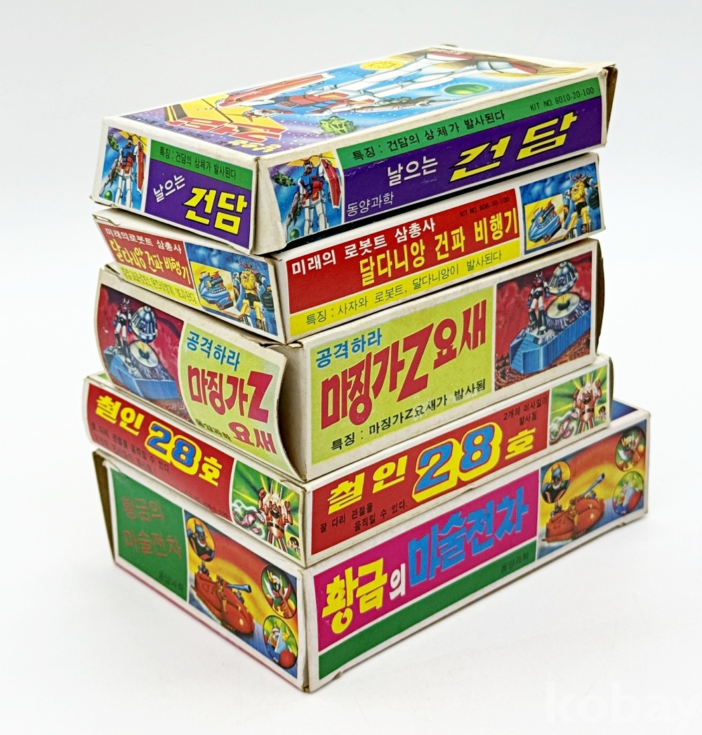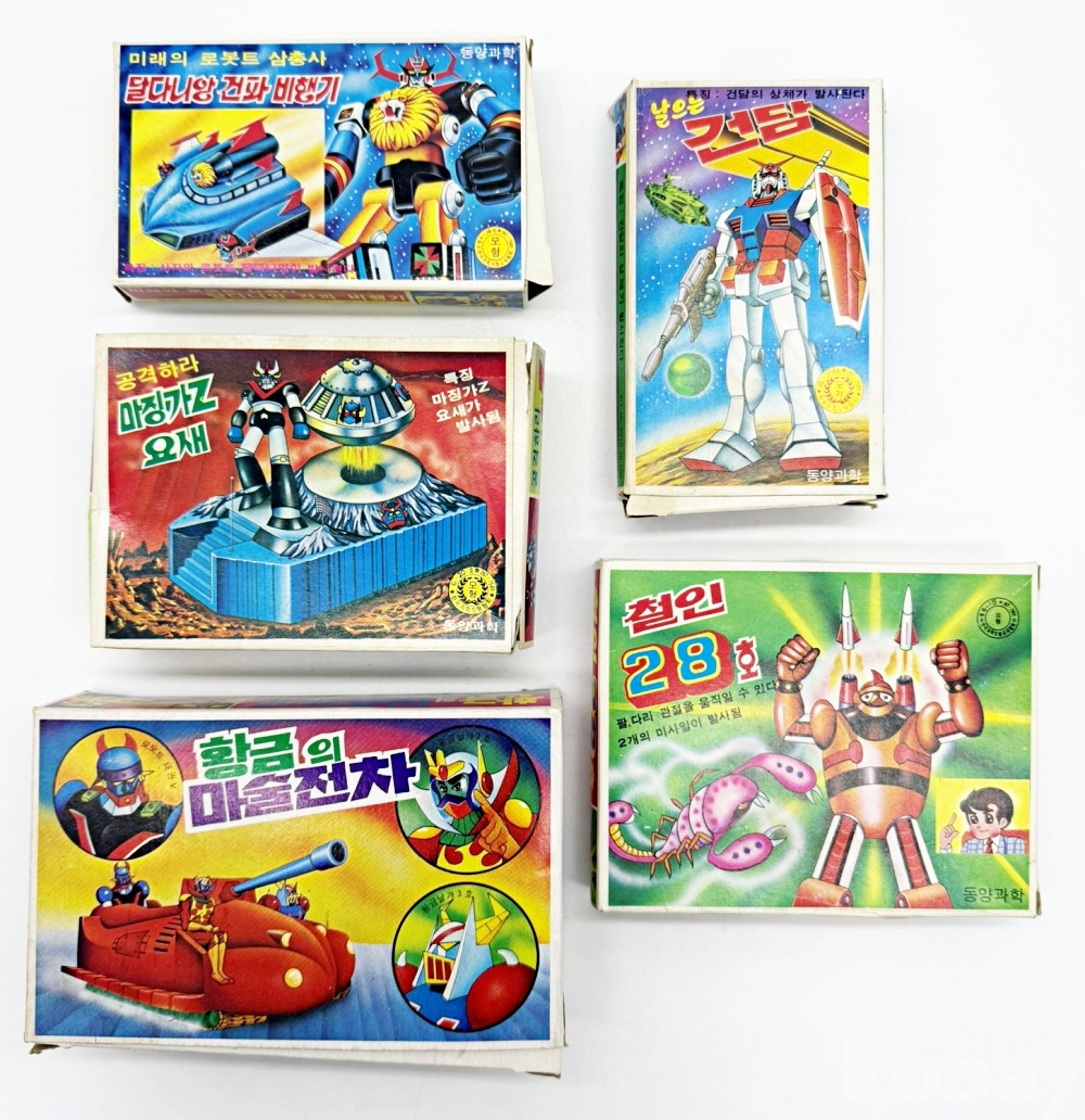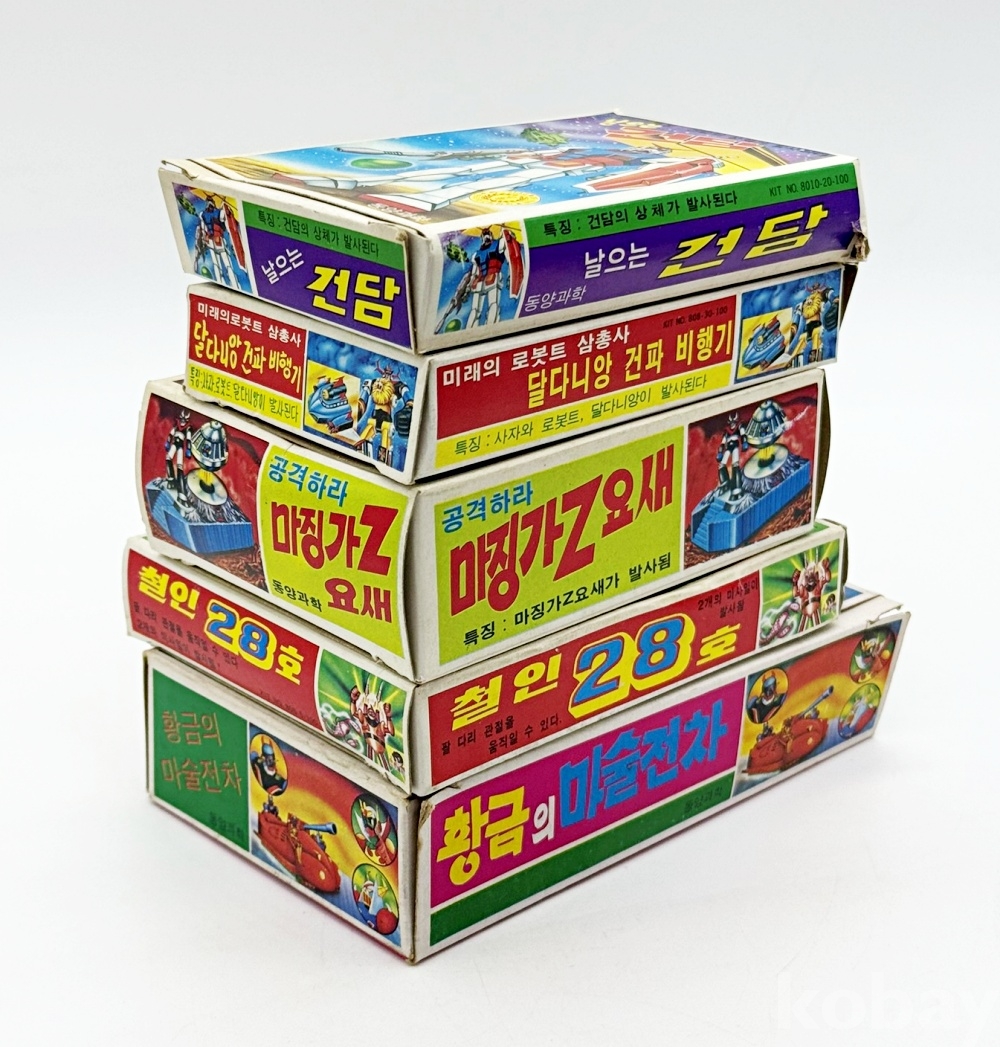 상품설명 | 1. 미래의 로봇트 삼총사 '달다니앙 건파 비행기' / 12 x 7.3 cm 2. 공격하라 마징가Z 요새 / 12 x 8.5 cm 3. 황금의 마술전차 / 14.7 x 9 cm 4. 날으는 건담 / 7.5 x 12 cm 5. 철인 28호 / 13 x 10 cm 총 5점. ※ 내용물이 없는 빈 박스입니다. | ||