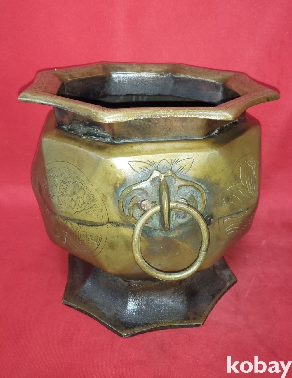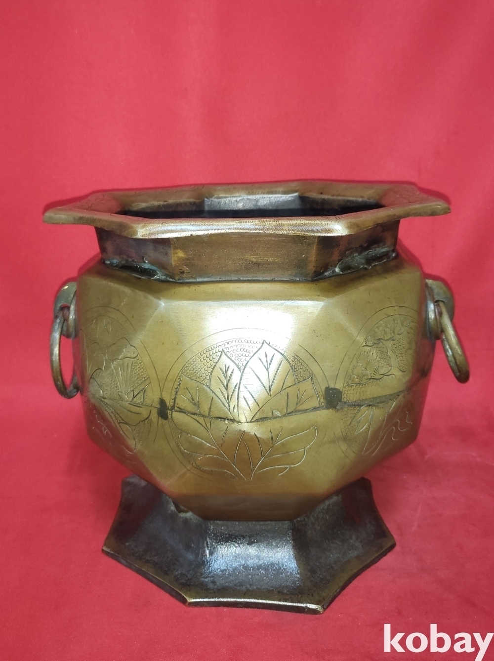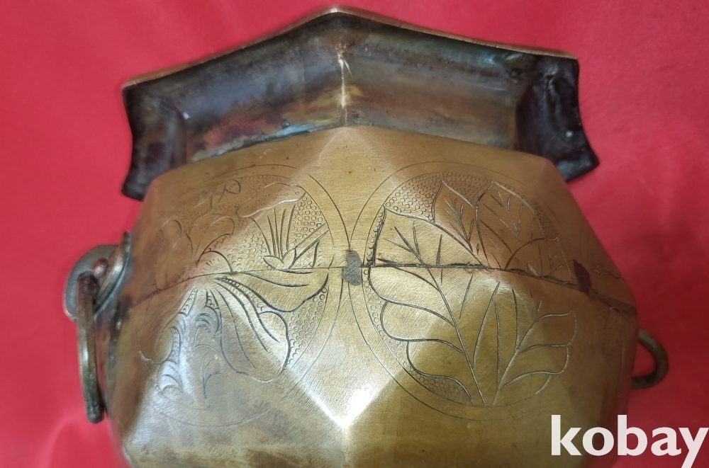 조선시대 청동으로 완성된 소나무.연잎 물결 연밥 문양 양이 8각42면 화로입니다,