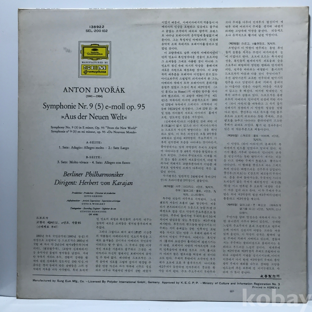 LP 35,750-1 드보르작 교향곡 제9번 신세계에서 - 카라얀 . 75 성음 자켓 EX+ 알판 EX+