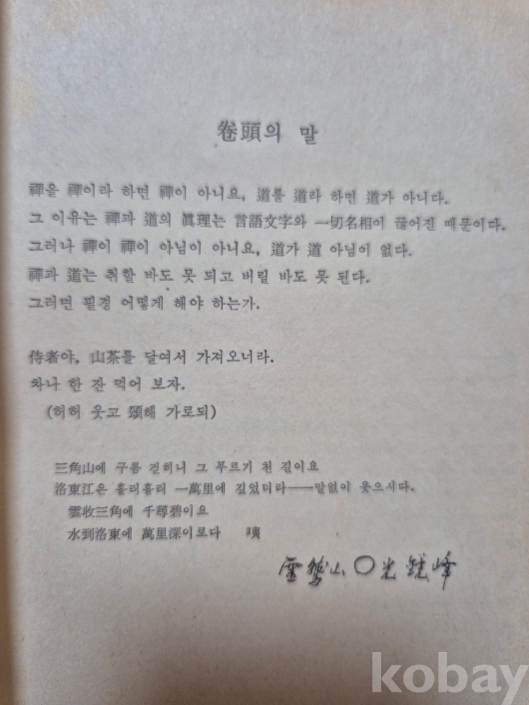 鏡峰 스님의 「卷頭의 말」. 저자의 「맺는말」과 3부의 本文 수록.