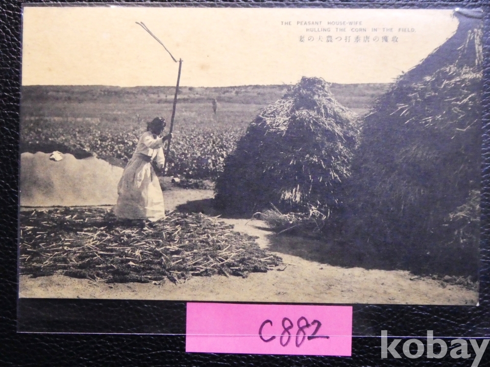 ▣한국근대엽서(진본): 조선 시골 농부의 부인이 농작물을 타작하는 모습, 대정사진공예소 발행/1매.