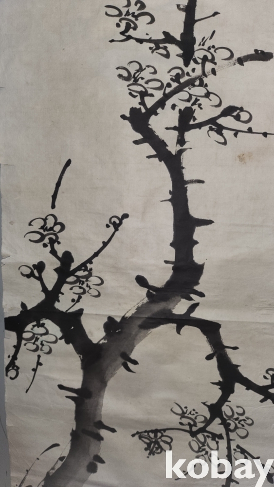 한국화가 의제 허백련 수결이 보이는 종이에 채색된 매화 그림입니다,