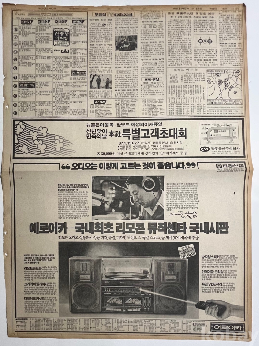 태광 오디오 신문광고가 실린 조선일보 낱장입니다.