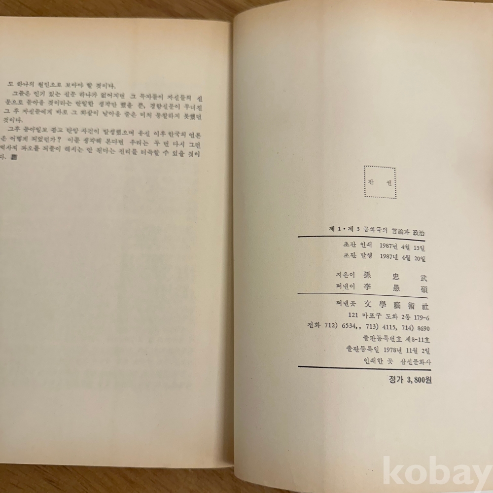 [한국현대사] 손충무, <제1, 제3공화국의 언론과 정치>, 문학예술사, 1987, p. 358, 상태 중하급(앞 부분 떨어진 부분 있음, 사진참조)