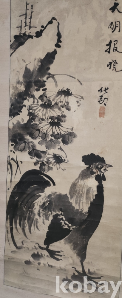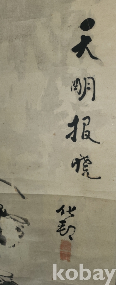 작가의 수결이 보이는 수묵화로 괴석에 닭 그림으로 족자입니다,