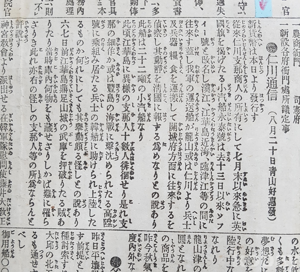 **** “仁川通信” 기사가 실린 1894년8월28일자 大阪朝日新聞 총 4면
