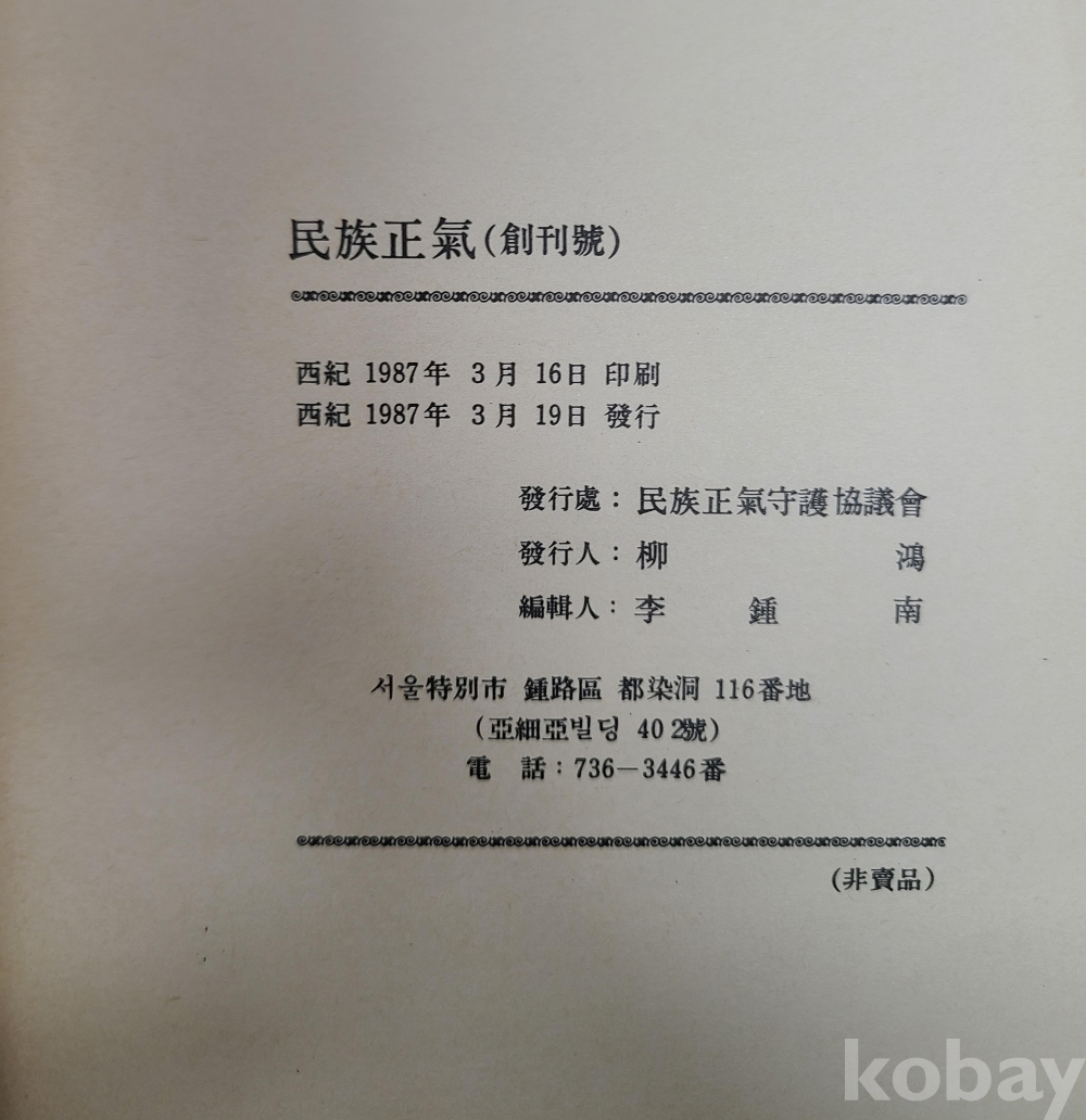 [創刊號] 民族正氣. 1987년3월19일. 민족정기수호협의회. 비매품. 101쪽